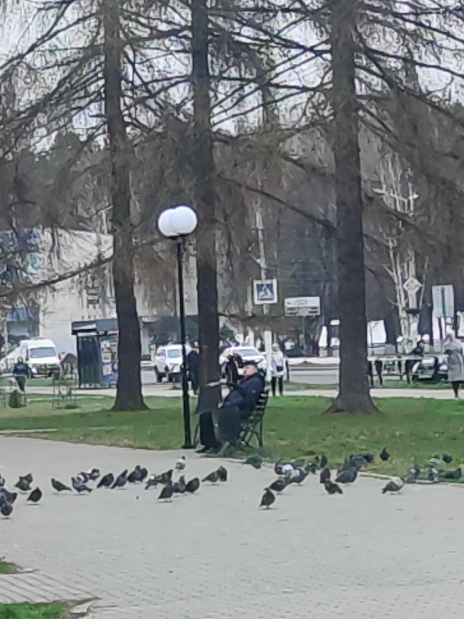 The image depicts a park scene in Chaikovsky, Russia. An elderly man sits on a green park bench, surrounded by pigeons on the paved walkway in front of him. The man wears a dark jacket and a hat. Seve…read more