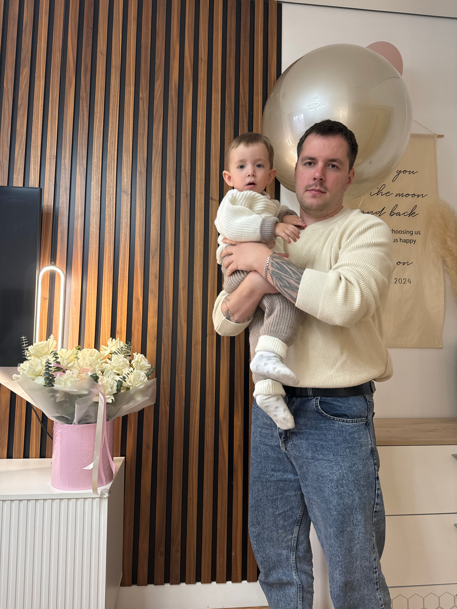 The image shows a man holding a baby indoors. The man is wearing a cream-colored sweater and blue jeans. He has tattoos on his left arm. The baby is wearing a matching cream-colored sweater and pantsβ¦read more