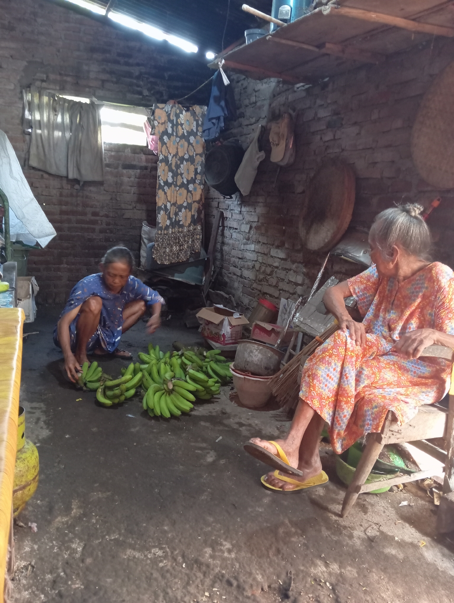 Two elderly women are in a rustic, cluttered room, likely in Baron, Indonesia. The walls are brick, and the floor is a dark, uneven surface. Sunlight enters from a window. One woman, seated on a woodeβ¦read more