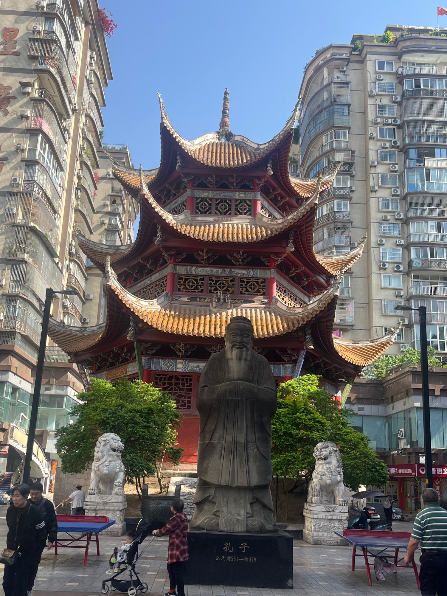 This vibrant daytime image captures a bustling urban scene in Jiangjin, China, combining traditional Chinese architecture with modern development. The central focus is an ornate, multi-tiered pagoda-s…read more
