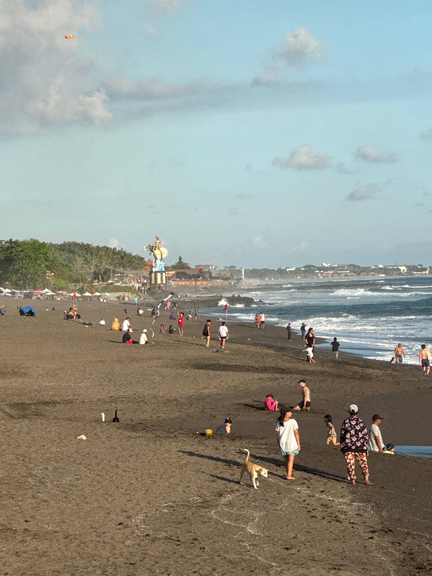 The image shows a beach in Munggu, Indonesia. The sand is dark gray, and there are numerous people on the beach, some swimming in the ocean. A dog is running near a woman in a white dress. Other peopl…read more