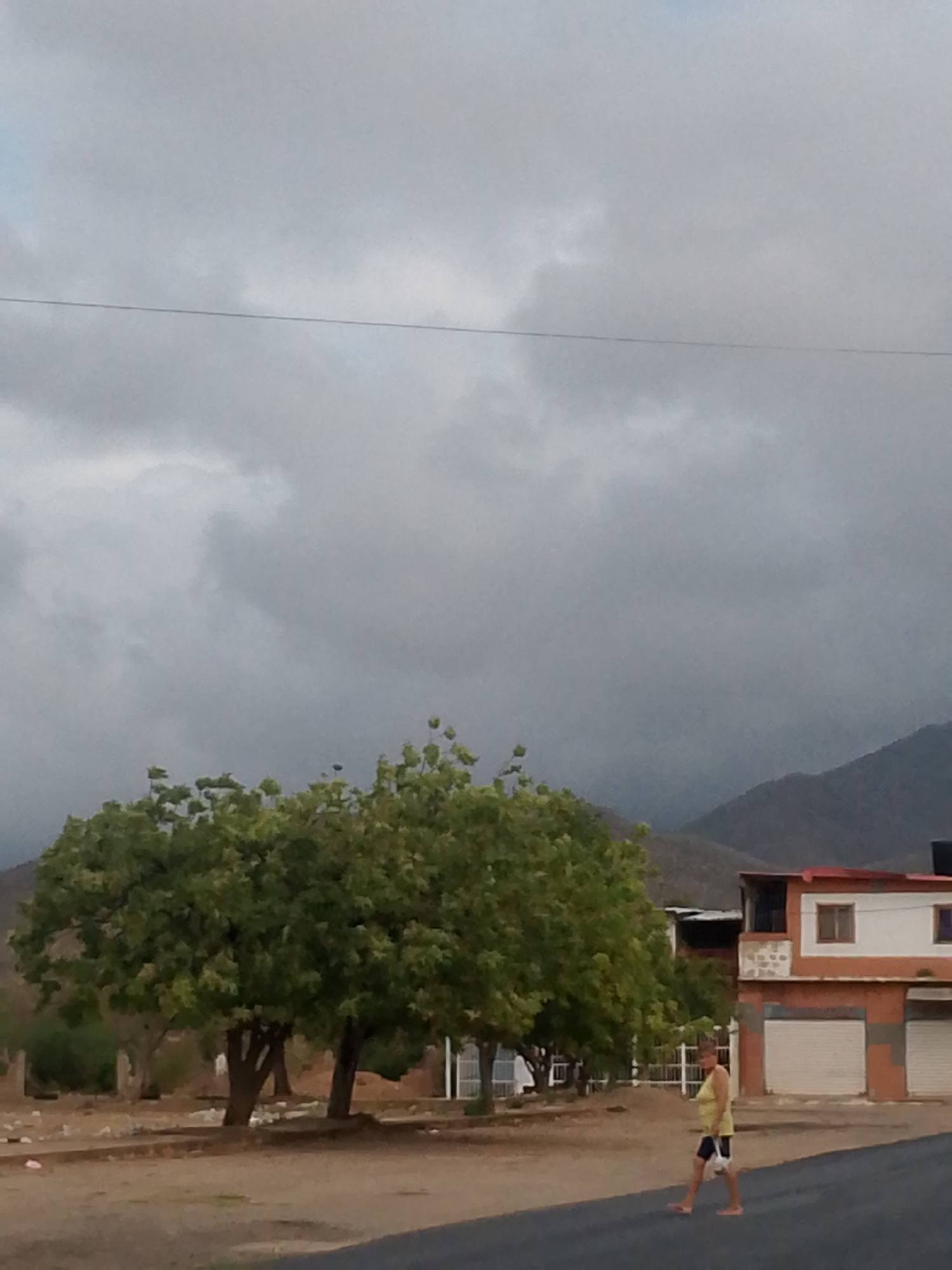 The scene depicts a street in what appears to be the city of Juan Griego, Venezuela. A middle-aged woman dressed in a yellow tank top and dark shorts is walking across the street. Behind her, there is…read more