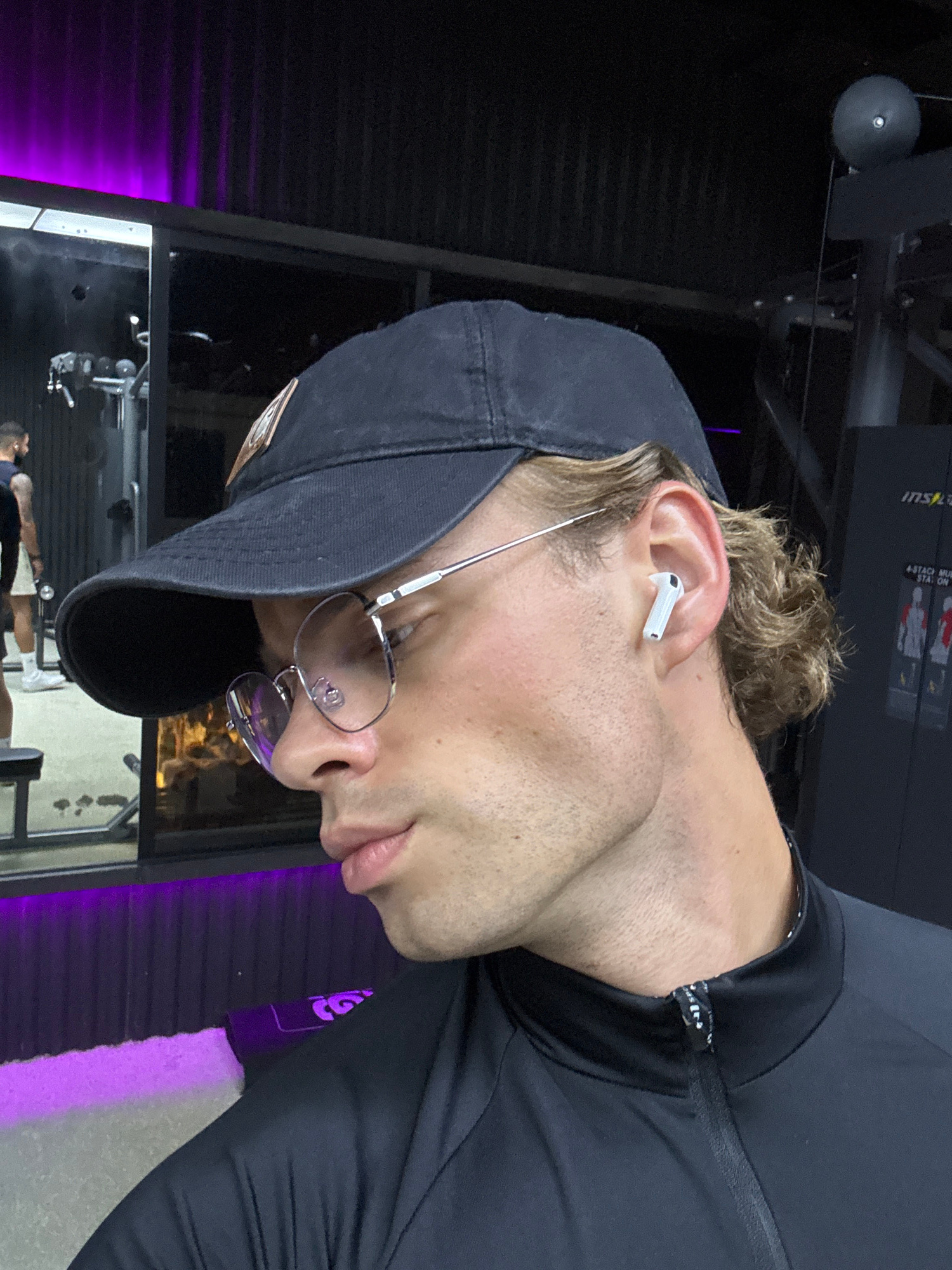 A man is shown from the head down to just past the shoulders, wearing a black baseball cap, glasses, a white Airpod in his left ear, and a black athletic shirt. He is in a gym with purple LED lighting…read more