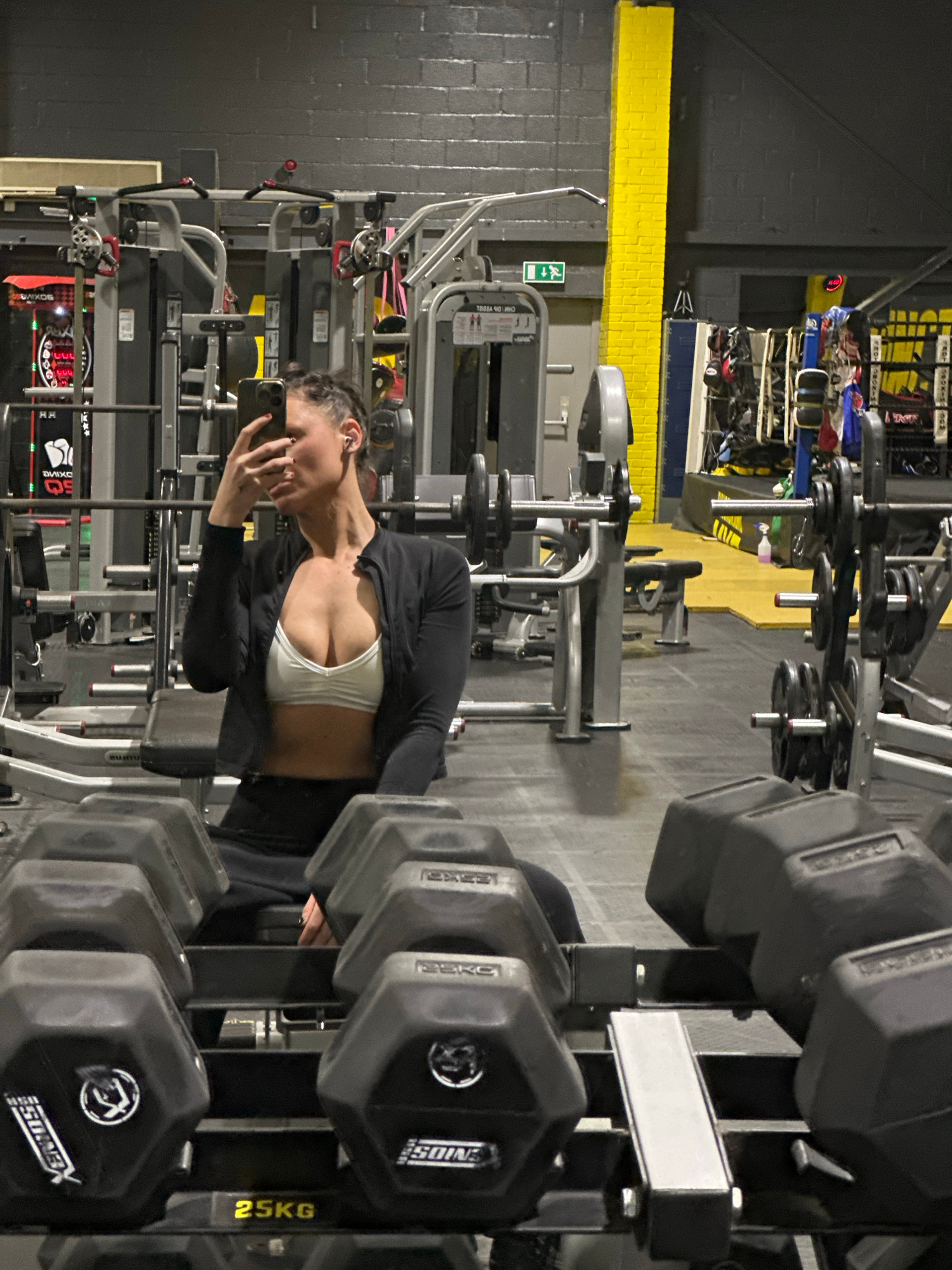 A female individual is captured in a mirror selfie within a gym facility located in Tunbridge Wells, United Kingdom. The subject, positioned centrally, wears a black unzipped jacket over a white sport…read more
