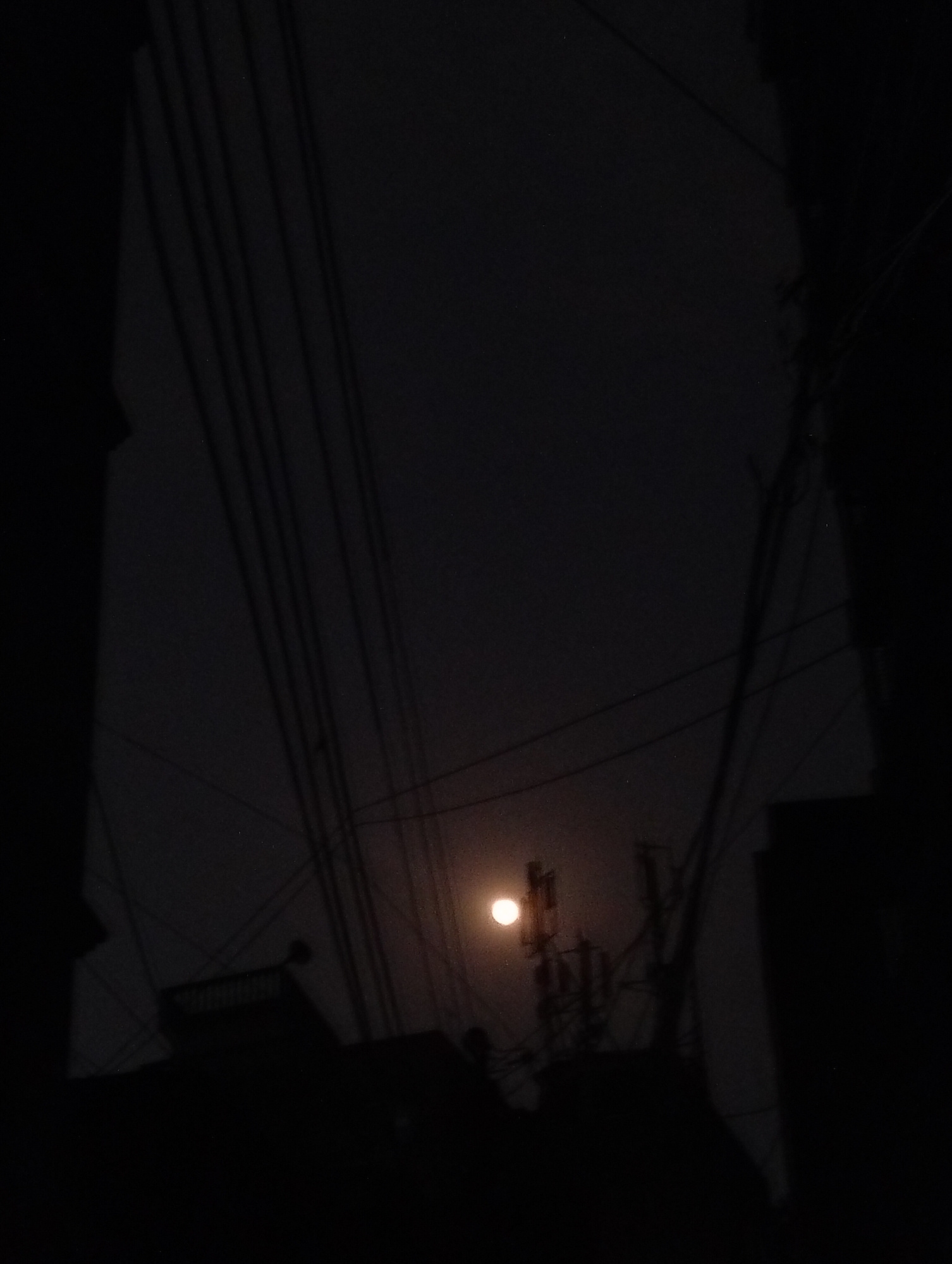 The photograph, likely taken in Dhaka, Bangladesh, depicts a night scene dominated by darkness. The light source is a dim moon or street lamp positioned behind a telecommunications tower and a web of…read more