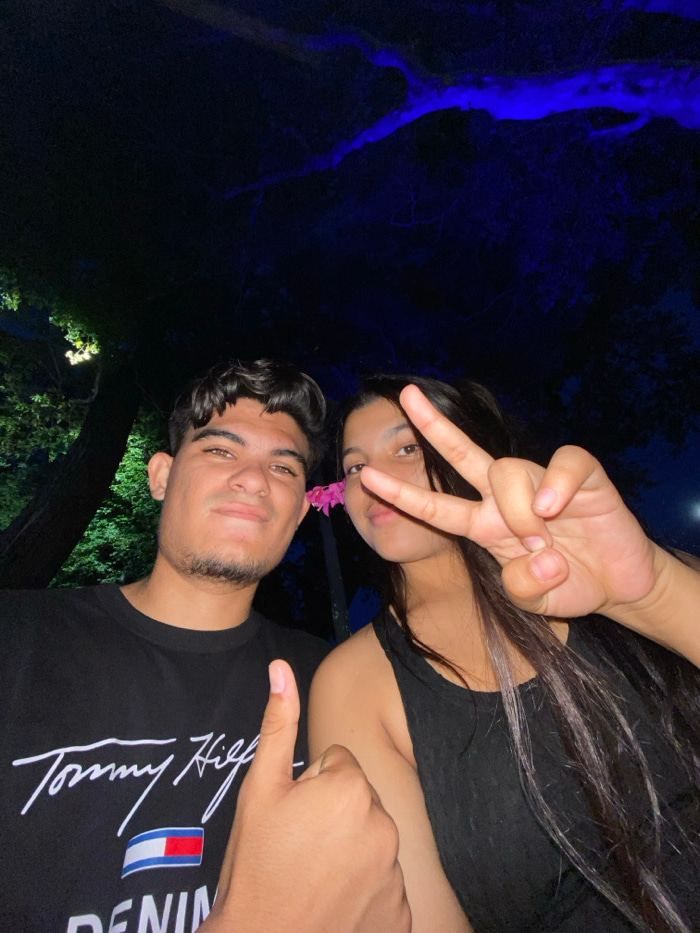 A young man and woman pose for a selfie at night. The man wears a black t-shirt with the Tommy Hilfiger logo. A pink flower is tucked behind his ear. The woman, positioned behind him, makes a peace si…read more