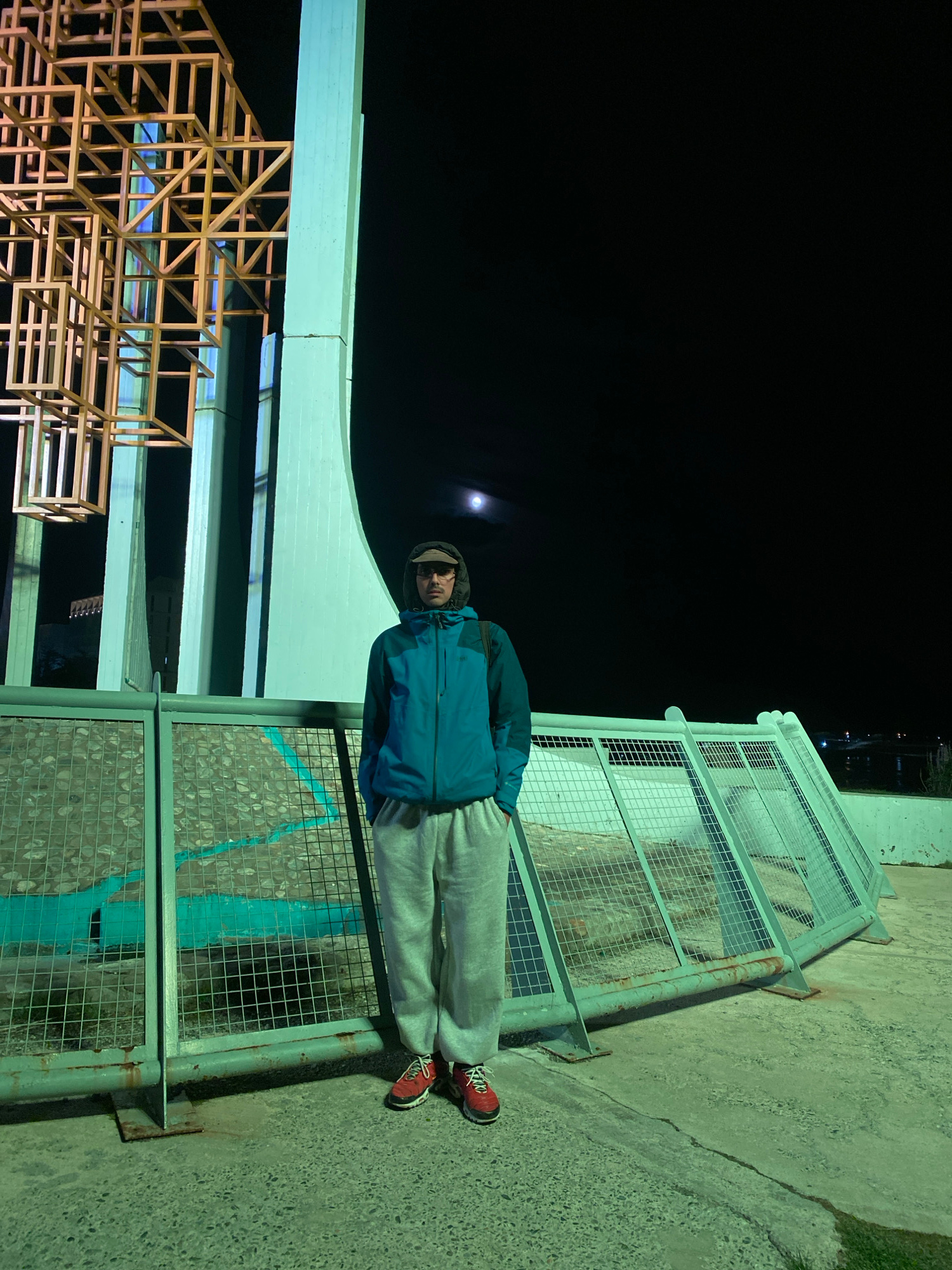 A person stands in front of a structure at night. The individual is wearing a blue jacket, grey sweatpants, red shoes, and a hooded sweatshirt pulled up, obscuring some of their face. They are positio…read more