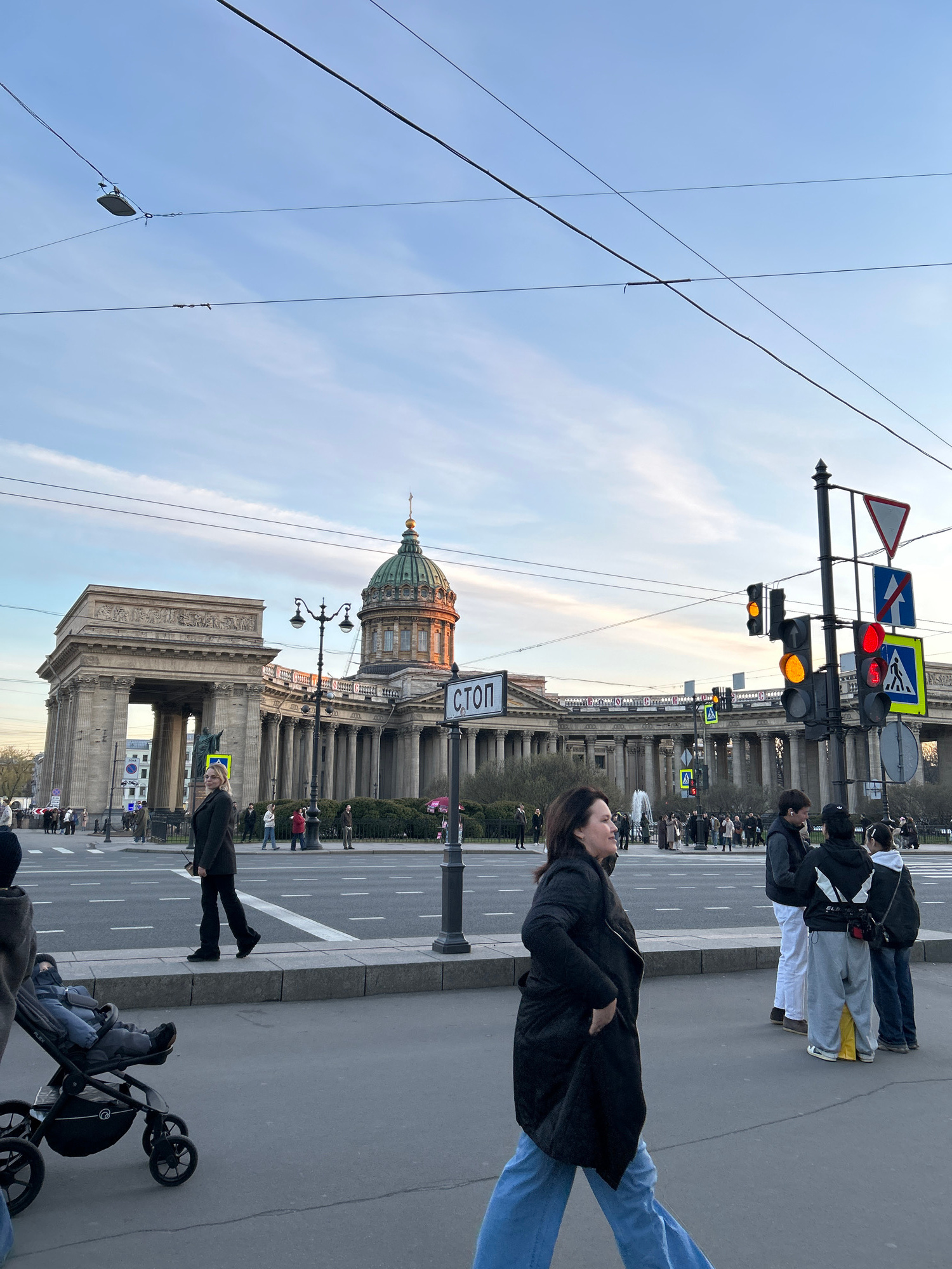 The image captures an urban street scene in Saint Petersburg, Russia, likely late afternoon or early evening, given the golden light on the buildings and the mix of blue and pale orange in the sky. Th…read more