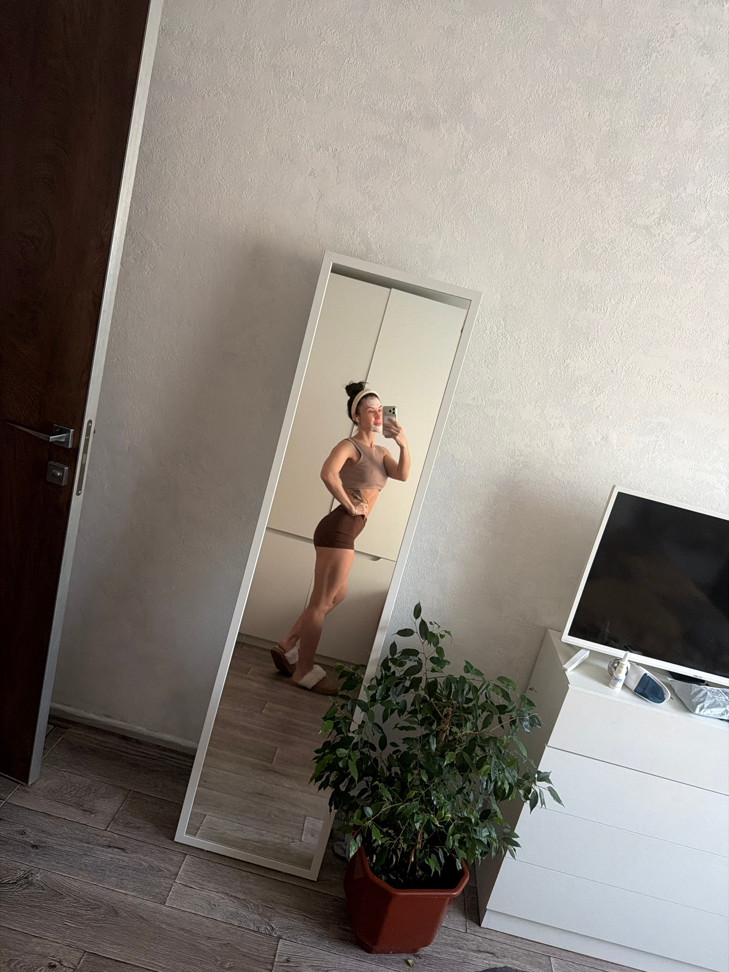 This image, rotated 90 degrees clockwise, captures an indoor scene, likely a hallway or room in Perm, Russia, featuring a woman taking a mirror selfie. In the center, a tall, white-framed full-length…read more