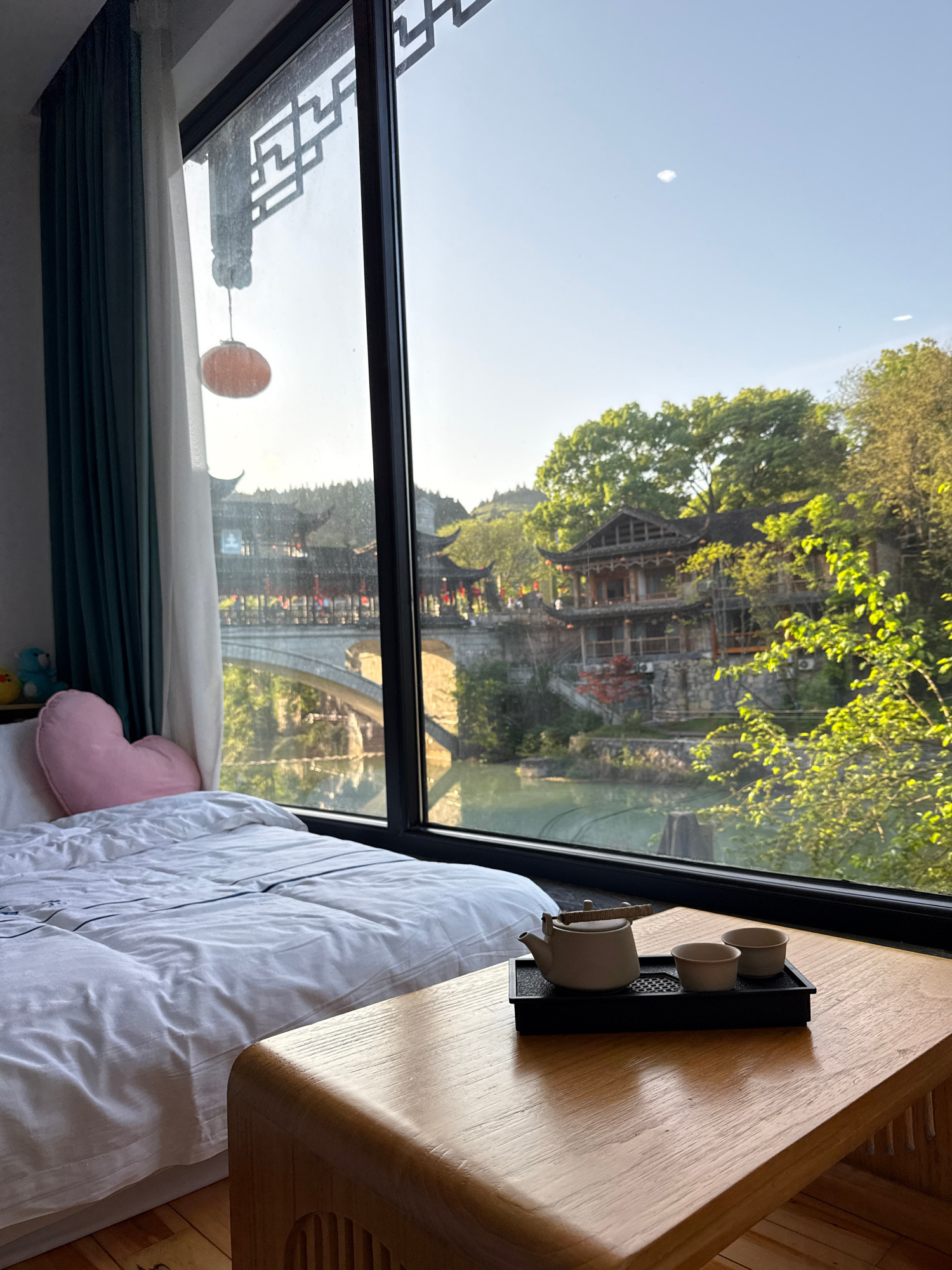 The image depicts a view from a bedroom or lodging in Furong, China. The window, with a decorative top frame, provides a view of the city. Traditional buildings and bridges are visible through the win…read more