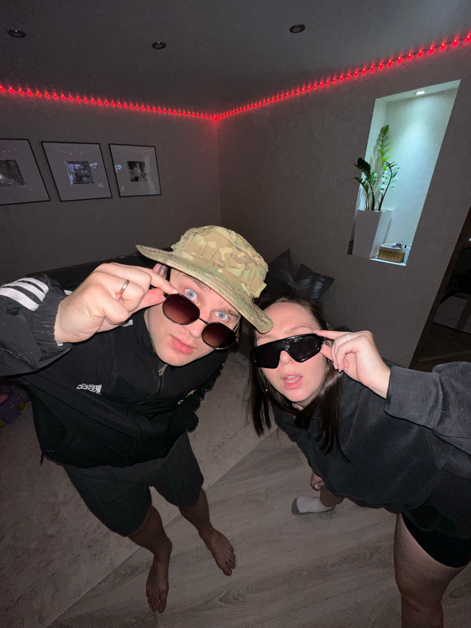 This indoor photograph, taken in Chaikovsky, Russia, features two individuals posing for the camera. The image is oriented such that the floor appears to be on the right side and the wall on the left.β¦read more