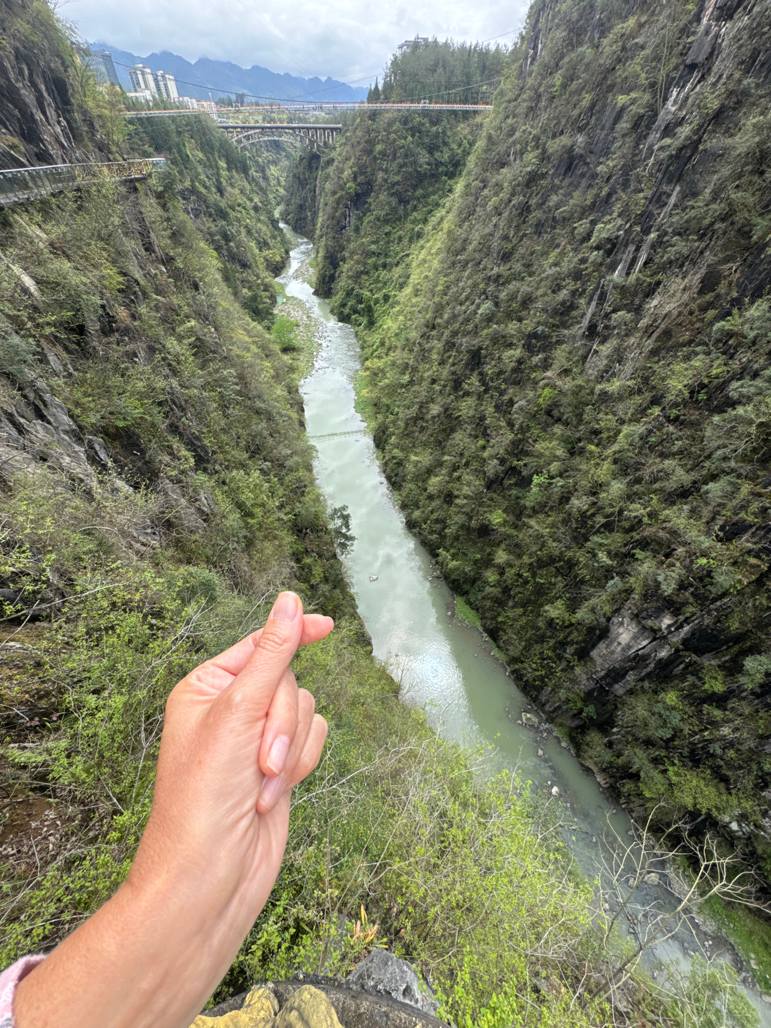 The image shows a view from a height looking down at a river running through a gorge in Qianjiang, China. Lush green vegetation covers the steep slopes of the gorge. In the foreground, a hand is makinβ¦read more