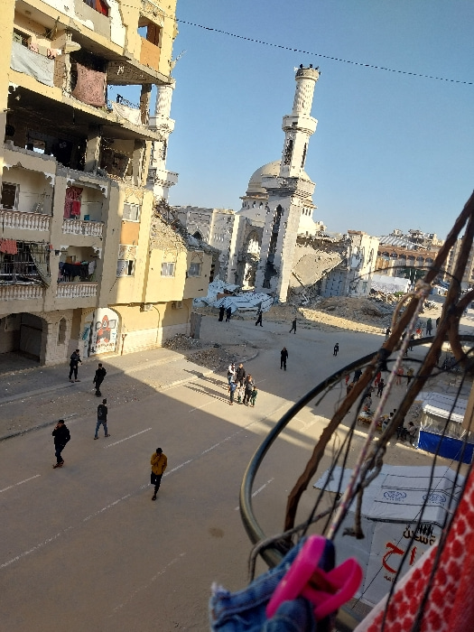 The image depicts an urban scene in Khan Yunis, Palestinian Territory, characterized by extensive structural damage under a clear blue sky. In the mid-ground, a multi-story building, likely residenti…read more