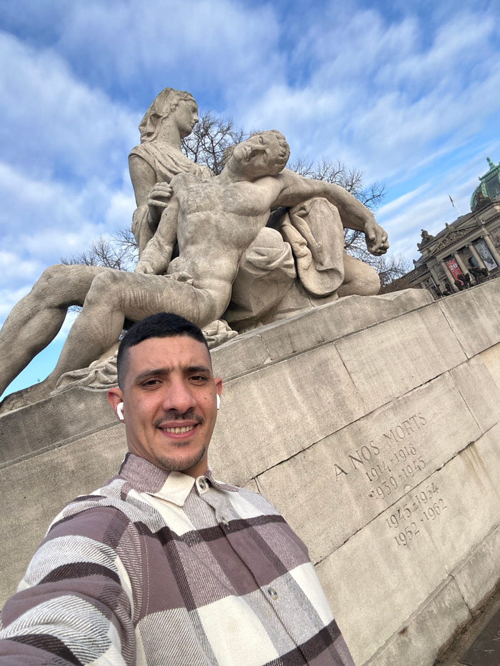 An outdoor, low-angle selfie depicts a male subject standing in front of the Monument aux Morts (War Memorial) located at Place de la République in Strasbourg, France. The man, with short dark hair an…read more