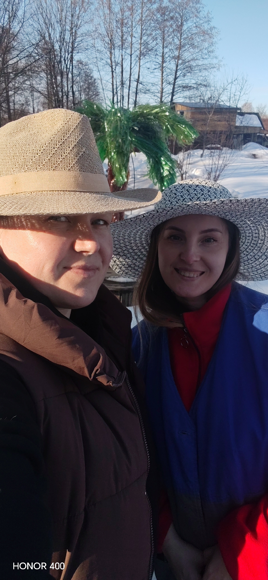This image depicts two individuals, likely women, posing outdoors in a snowy environment in the city of Noviy, Russia. The scene is illuminated by bright sunlight under a clear, light blue sky. The i…read more