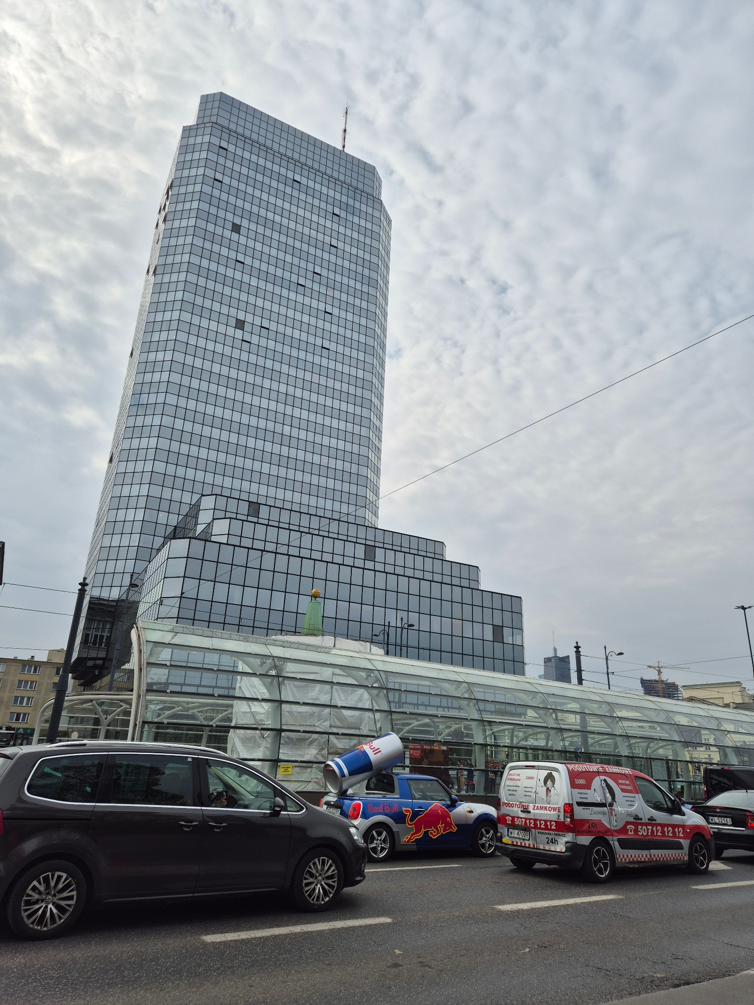 The image captures a street scene in Warsaw, Poland, featuring the Rondo 1 skyscraper, a modern high-rise with a glass facade. The building is set against a cloudy sky. In the foreground, there are se…read more