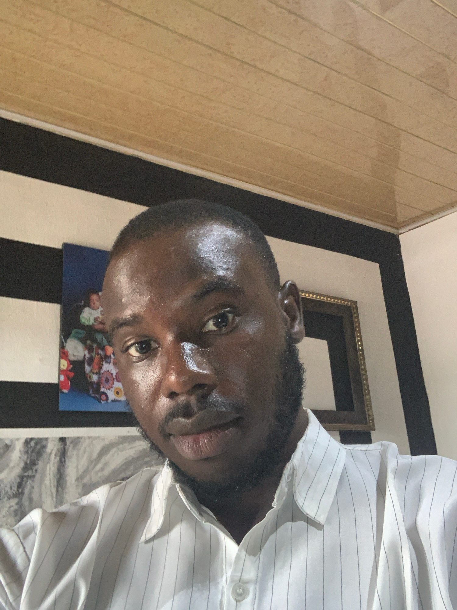 A close-up, tilted shot of a dark-skinned man wearing a white, vertically striped shirt with a visible button. The man has a full, dark beard and appears to have short hair. The background consists of…read more