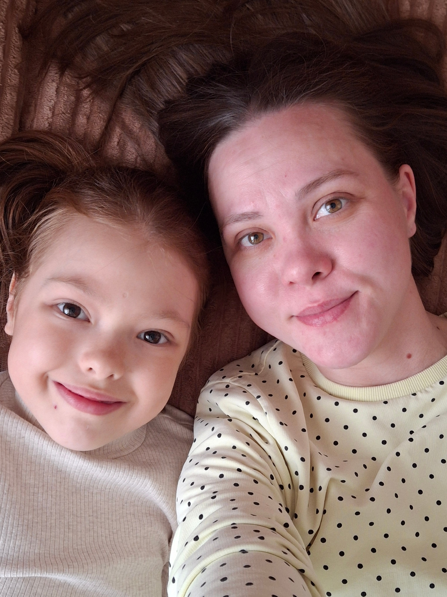 This eye-level, overhead shot, taken in Chaikovsky, Russia, features an adult woman and a young girl lying side-by-side, looking up at the camera with gentle smiles. The subjects are positioned diagon…read more