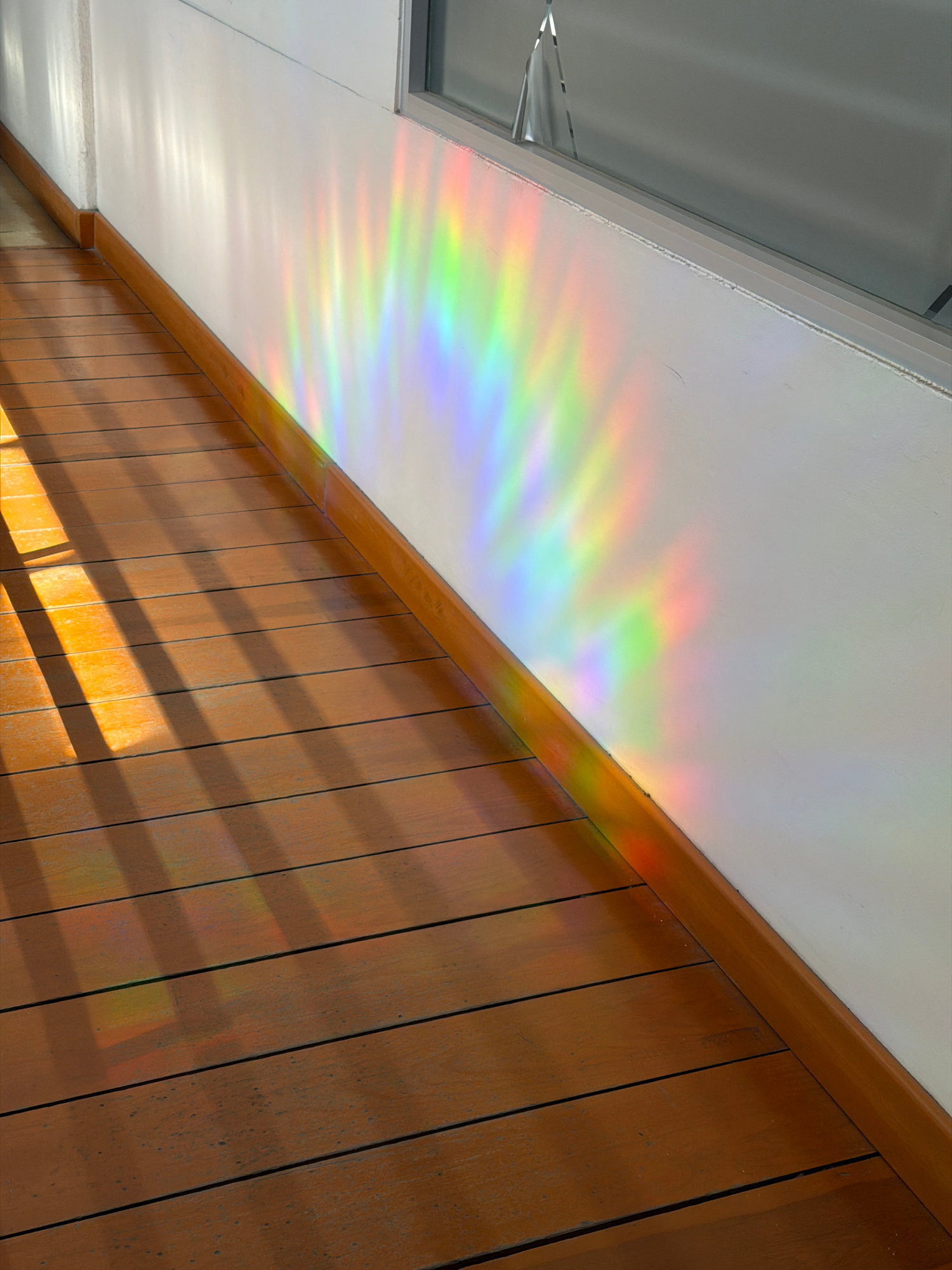 The image shows a section of an interior space with a white ceiling meeting a wood-paneled wall at an angle. Light refracting into a spectrum of rainbow colors shines across the ceiling near the wall.…read more