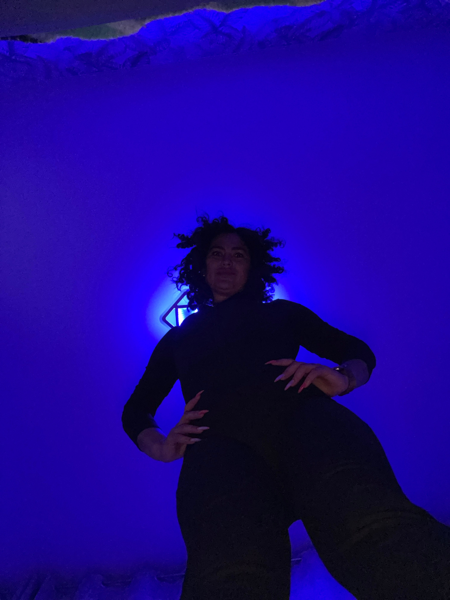 A person is seen in a low-angle shot against a bright blue background. The person has dark, curly hair and is wearing black clothing. One hand is raised towards the camera, displaying long fingernails…read more