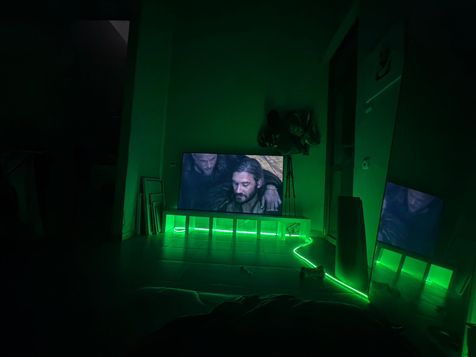 A dimly lit room with green lighting features a television displaying a video of two men. The TV is set on a white stand, also illuminated in green. To the right, a second television screen is visible…read more