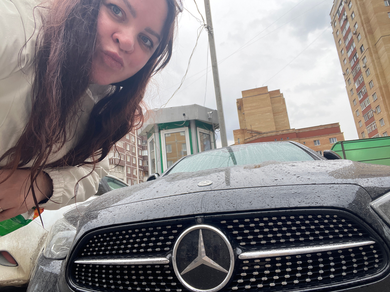 The image, when properly oriented, presents a close-up, selfie-style shot featuring a woman, a Mercedes-Benz car, and urban buildings under an overcast sky. The scene is located in Perm, Russia. The…read more