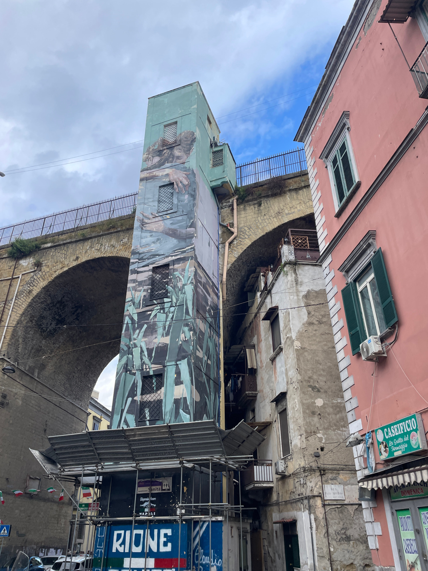 The image captures an urban street scene in Naples, Italy, specifically in the Sanità district, beneath the Ponte della Sanità viaduct. A tall, slender, mint-green building, identified as the Ascensor…read more