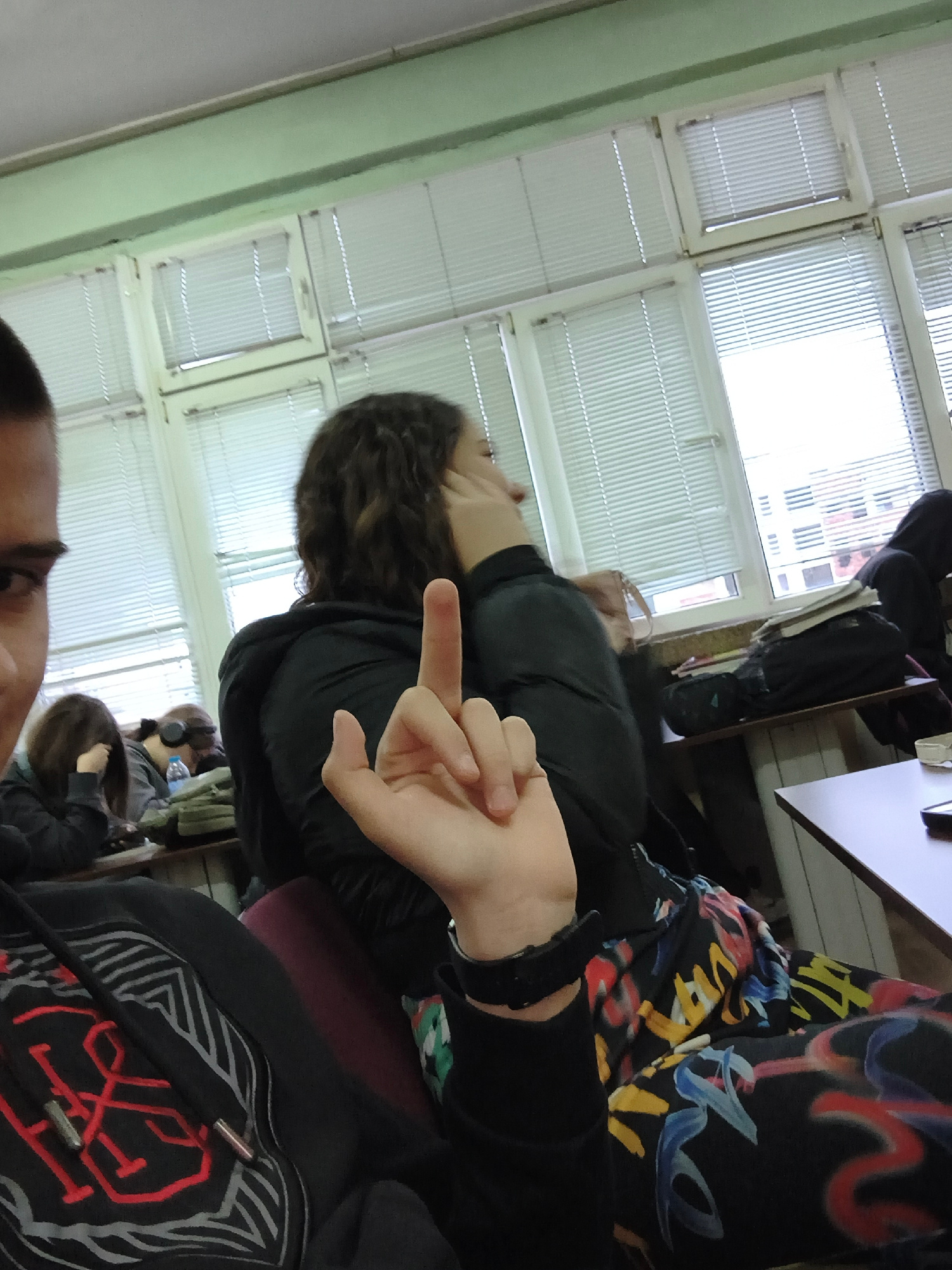 The image shows an indoor classroom scene. Several students are present, with one individual displaying the middle finger gesture prominently towards the camera. Other students are seated in the backg…read more