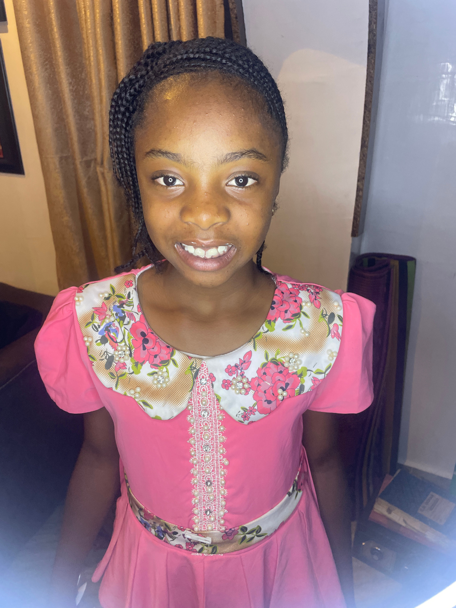 A young girl is shown in a brightly lit, indoor environment. She is smiling and facing the camera. The girl has dark skin and her hair is braided. She is wearing a pink dress with a white floral patteβ¦read more