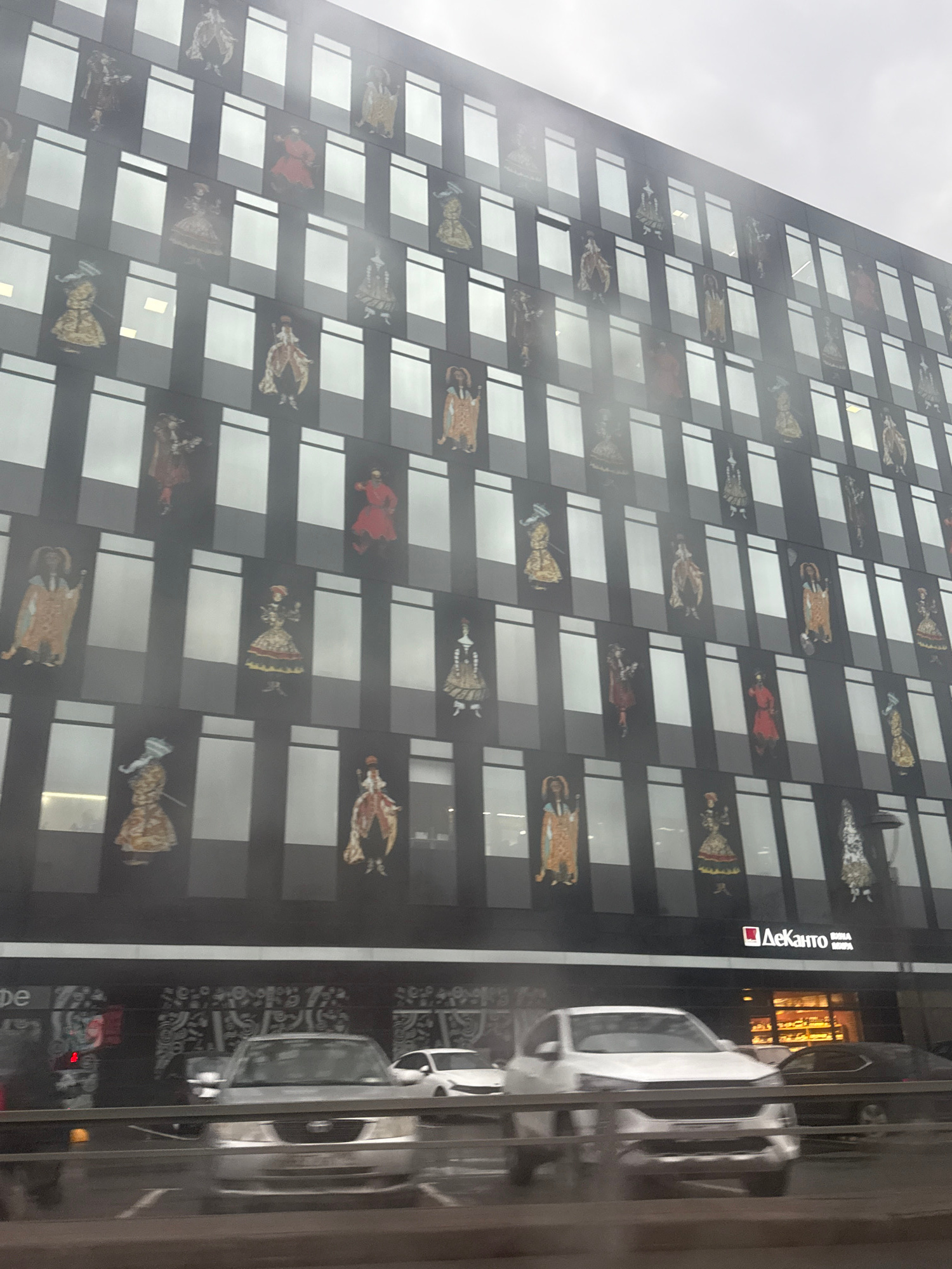 The image shows a multi-story building, likely a hotel, in Saint Petersburg, Russia. The building's exterior is characterized by a dark facade with evenly spaced horizontal rows of decorative panels.…read more