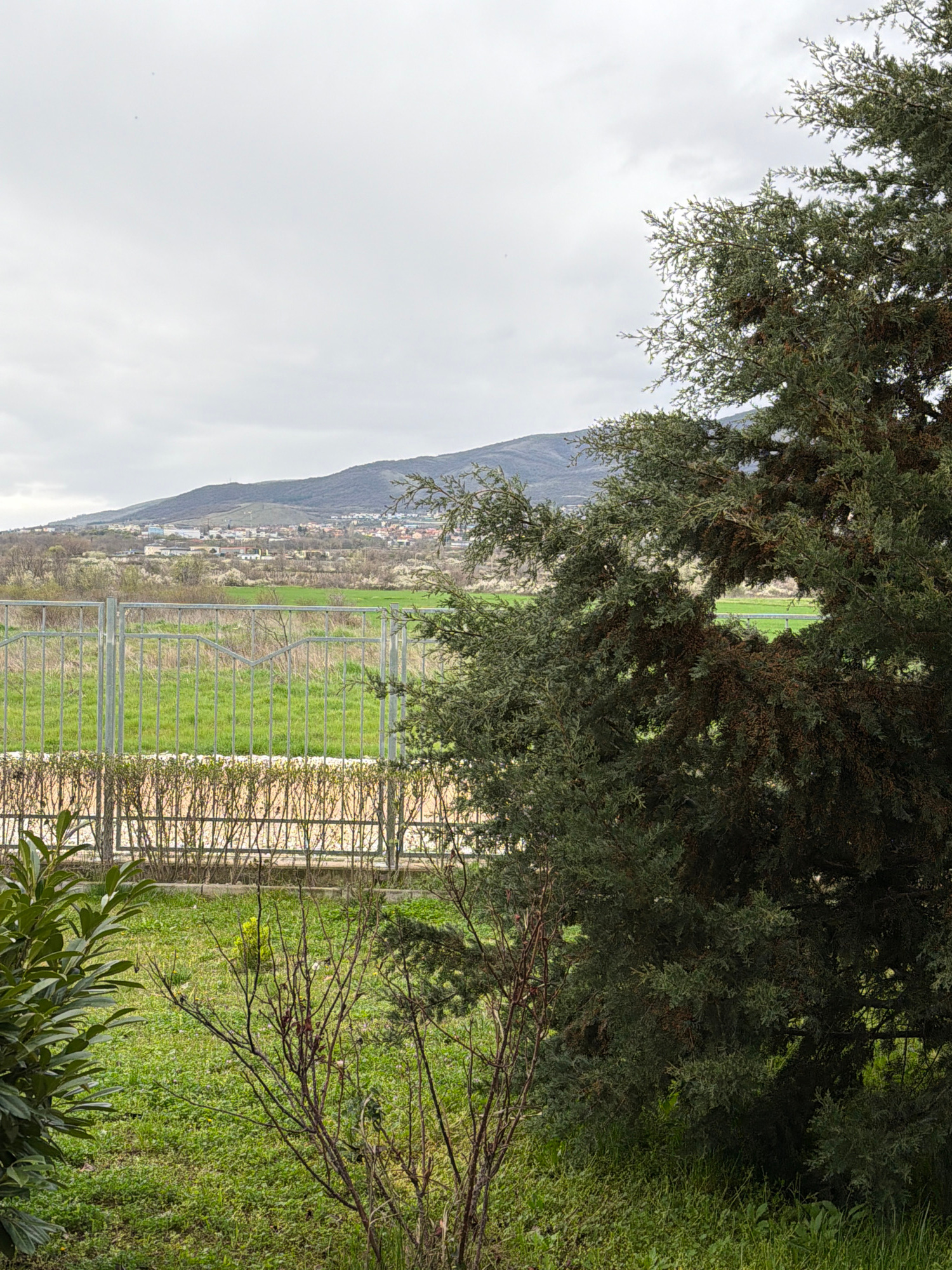 The image shows a view of Parvenets, Bulgaria, from a slightly elevated position, partially obscured by foliage. In the foreground, there's a green area, possibly a garden or park, with a metal fence…read more