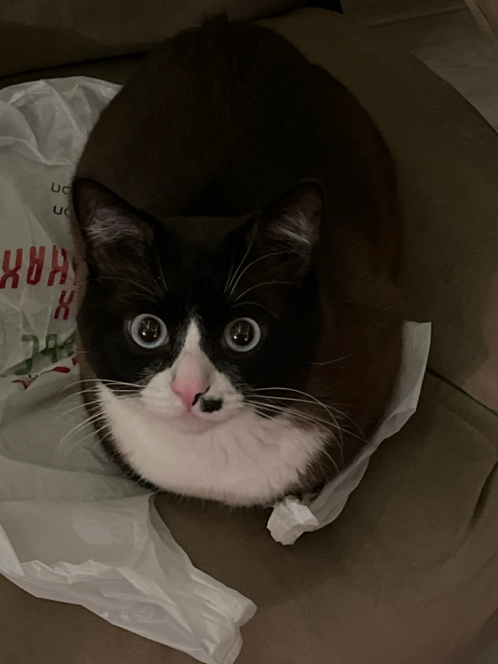 A tuxedo cat with big, round, blue eyes peeks up from inside a crumpled white plastic bag. The cat's fur is mostly black with white on its face, chest, and whiskers. The nose is pink. The bag sits insβ¦read more