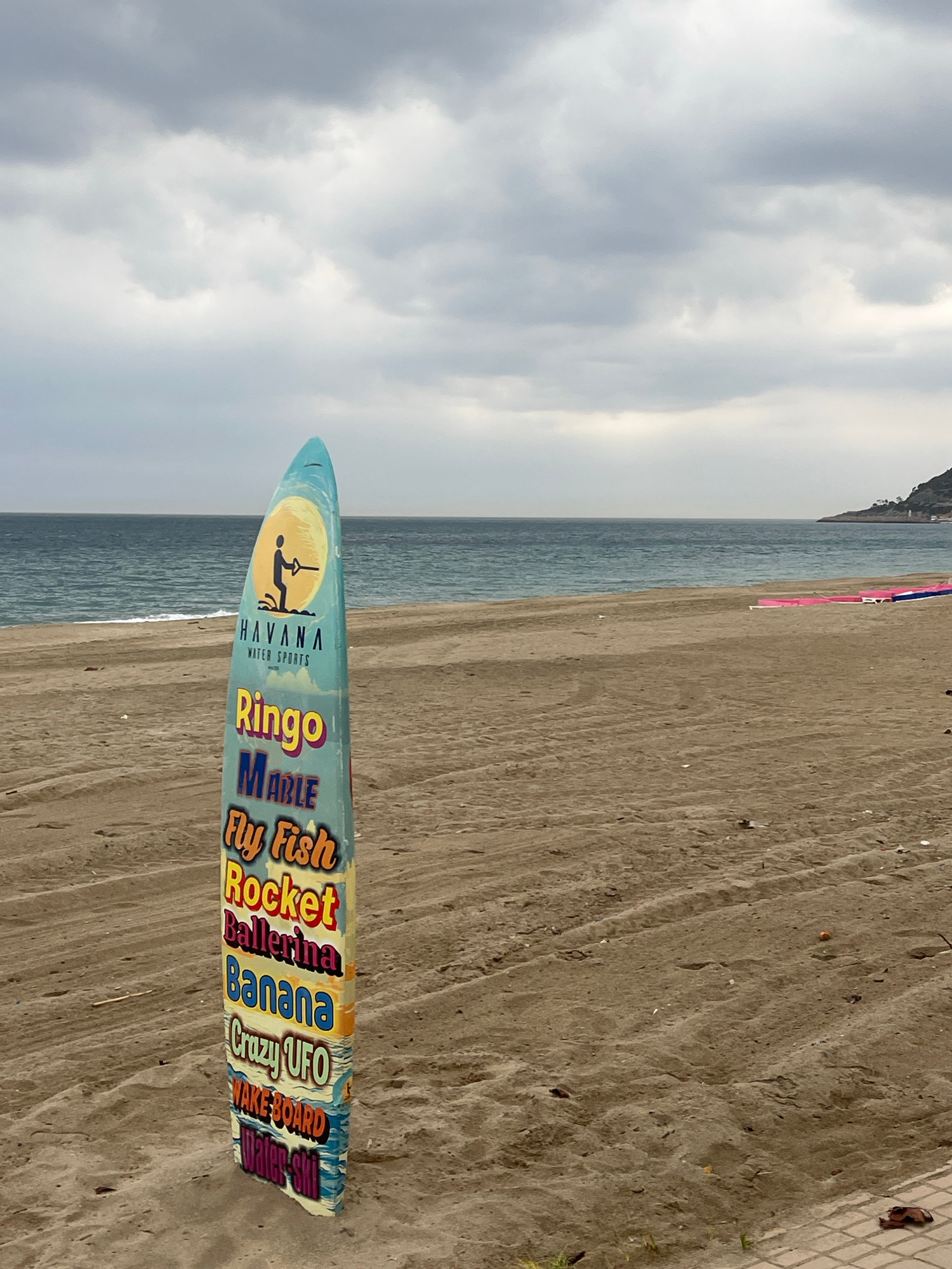 The image shows a beach scene in Alanya, Turkey. A light blue watersports board is partially buried in the sand on the right side of the frame. The board has the words "HAVANA WATER SPORTS" and a grap…read more