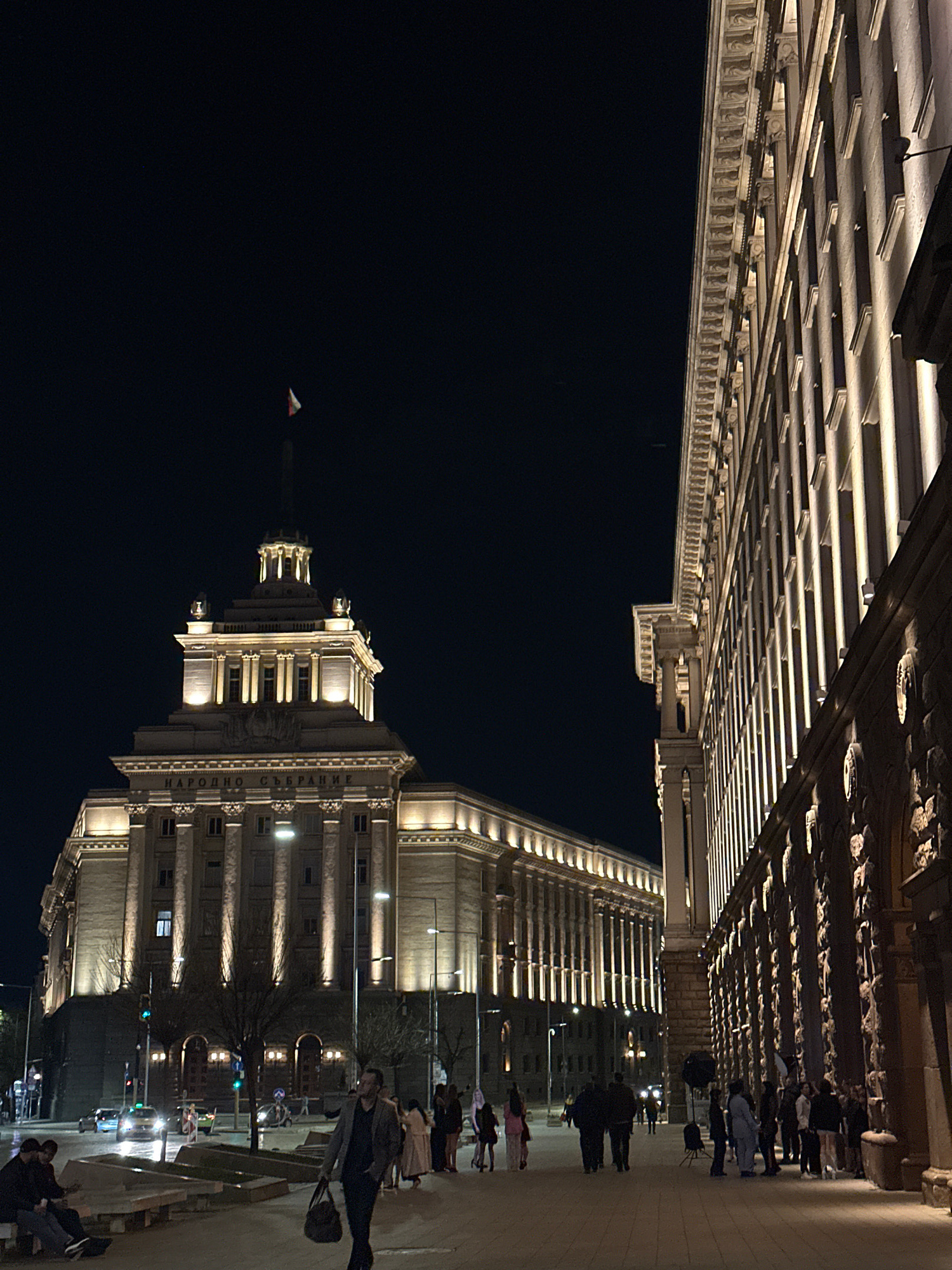 The image shows the city of Sofia, Bulgaria at night. The National Assembly building is illuminated on the right side of the image. On the upper portion of the image, there are architectural details o…read more