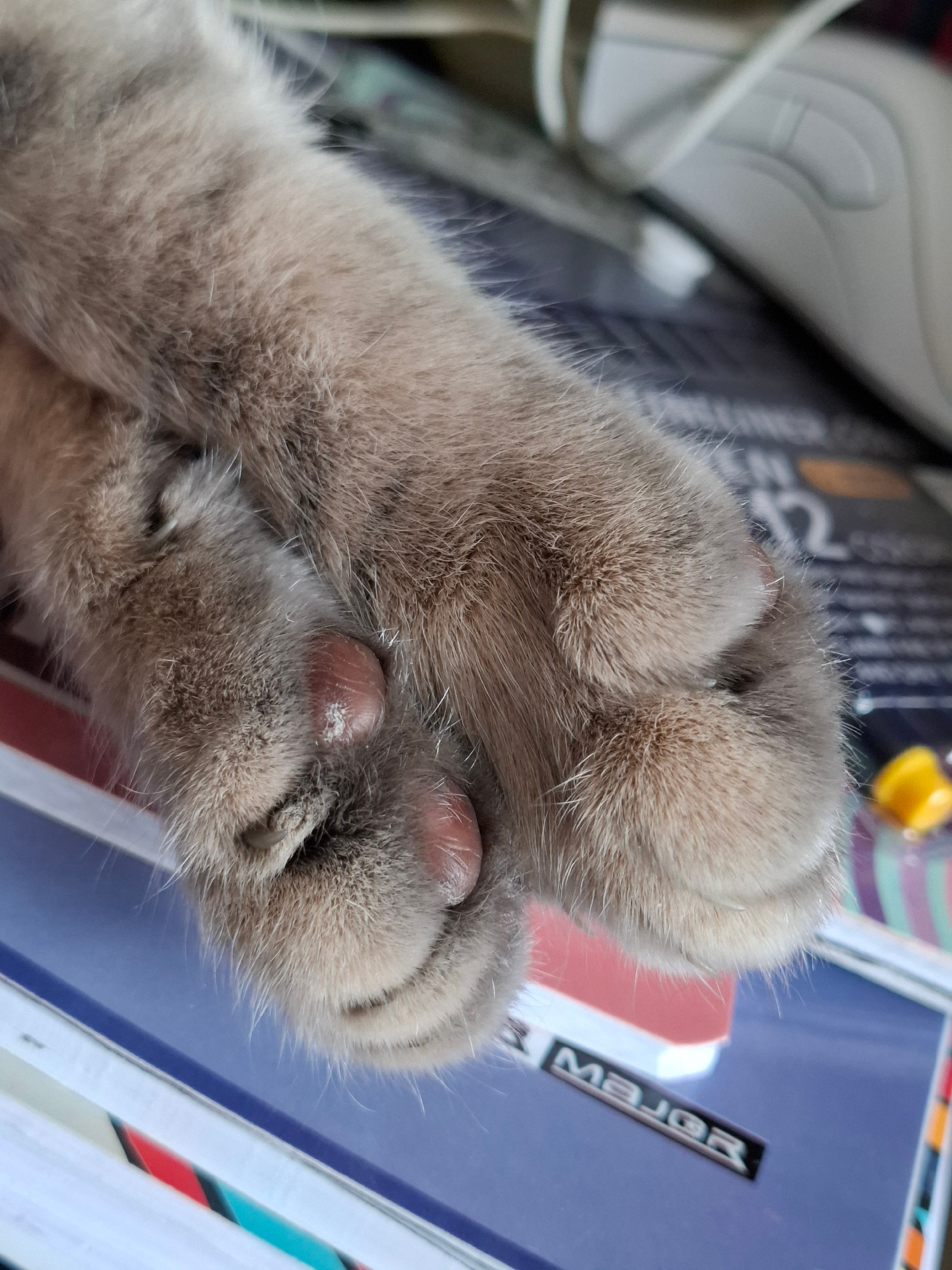 The image displays a close-up, high-angle view of the two front paws of a domestic cat, located indoors in Novi Sad, Serbia. The paws are covered in dense, light brown to greyish-tan fur, with individ…read more
