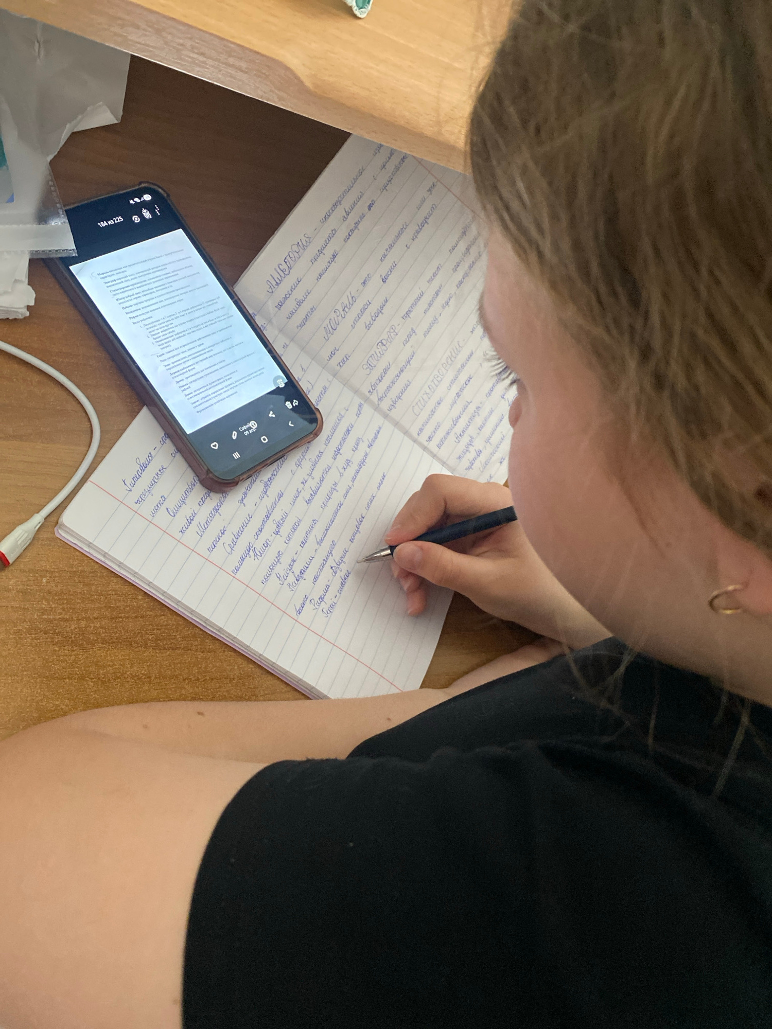 An overhead shot captures a person, likely female, engaged in studying or note-taking at a wooden desk. Her light brown hair partially obscures her face, but a small golden hoop earring is visible on…read more