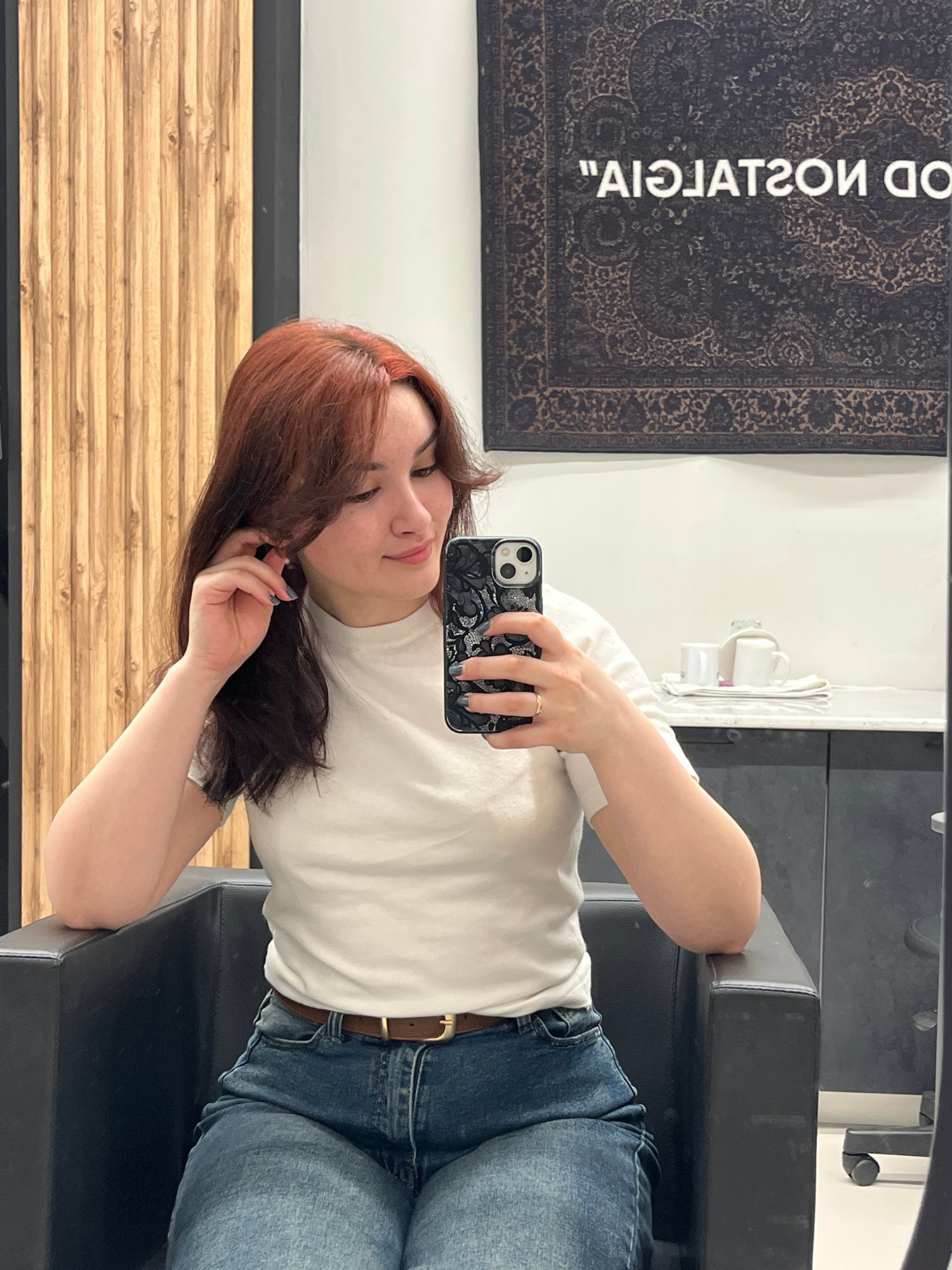 A young woman with auburn hair is taking a selfie in a mirror. She is sitting in a black chair with a brown belt around her jeans. Behind her is a wall with a rug hanging on it, and a wooden surface b…read more
