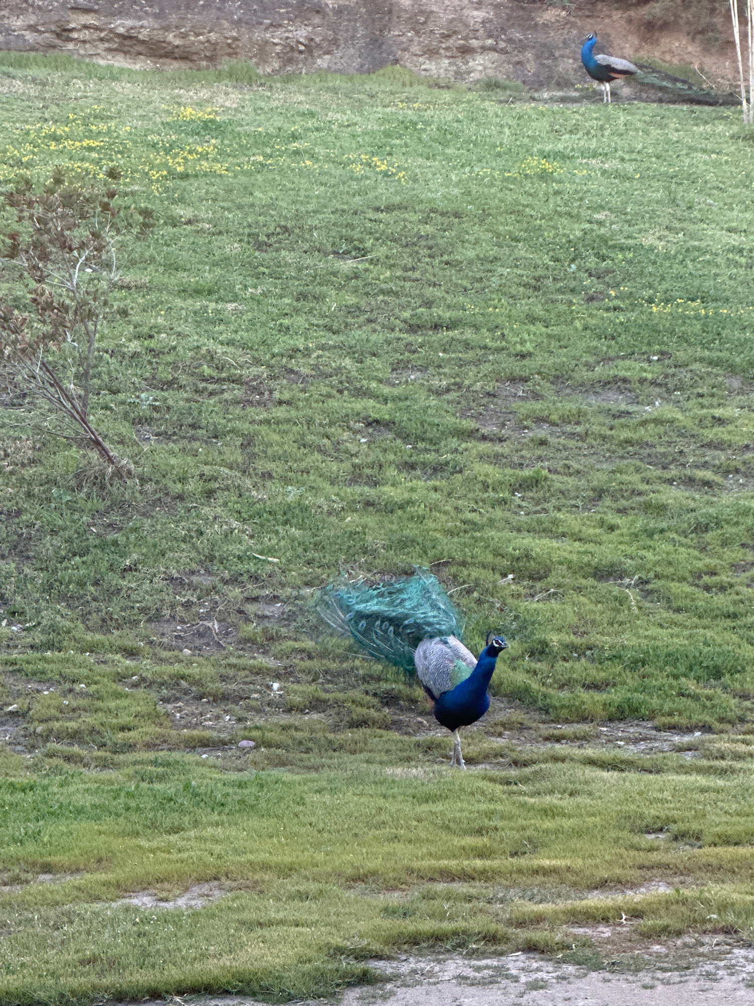 A landscape image shows two peacocks in Faliraki, Greece, likely in a park or natural area. The scene is dominated by green vegetation, possibly grass or moss. The peacocks are positioned on this gree…read more