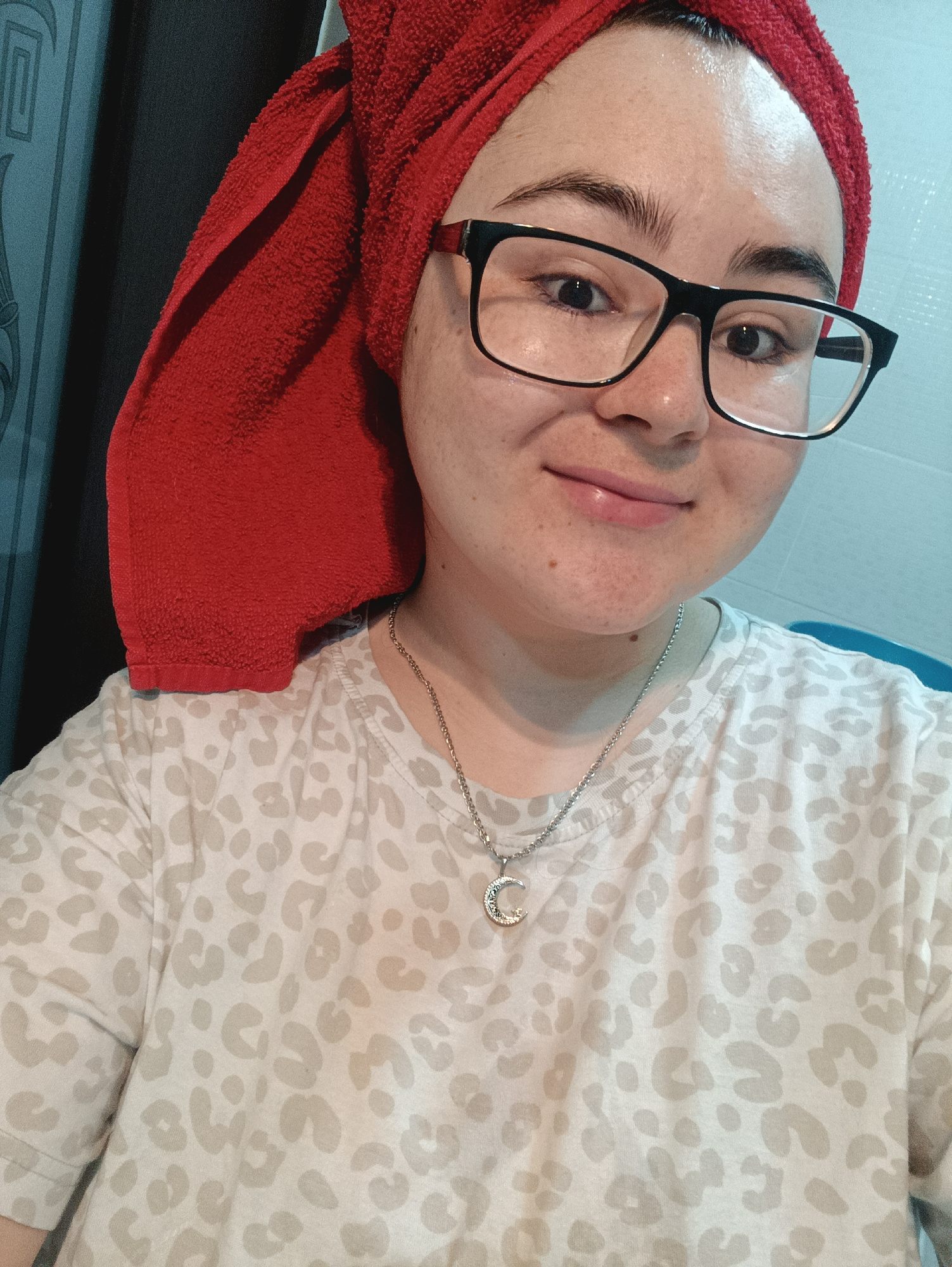 A young person is shown in a selfie. The individual has a red towel wrapped around their head and is wearing black-framed glasses. They have fair skin and a small, crescent moon necklace. The person iβ¦read more