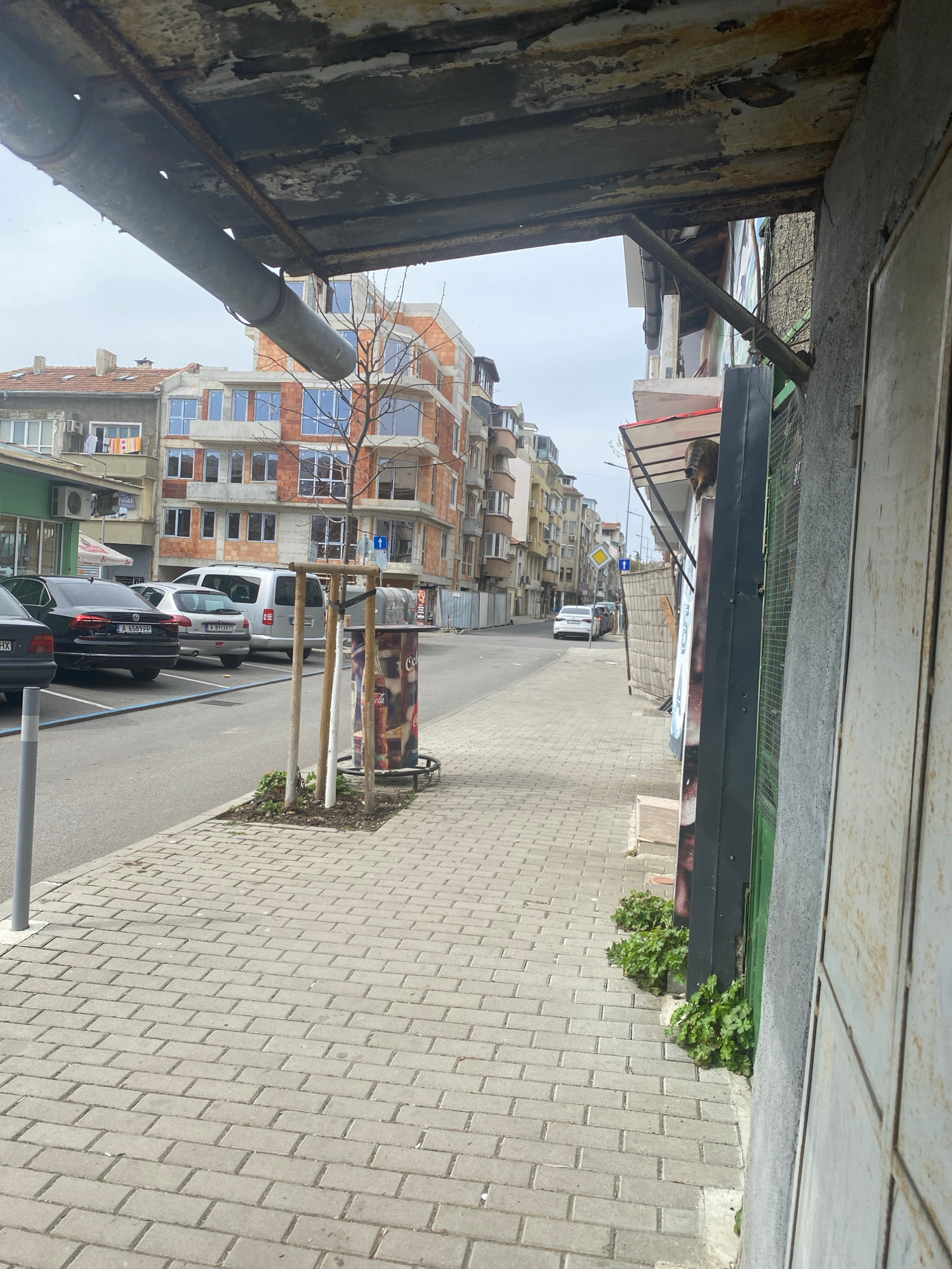 The image captures a street scene in Burgas, Bulgaria. A newly constructed building with brick facade and multiple windows is visible. Vehicles, including a white van and several dark-colored cars, ar…read more