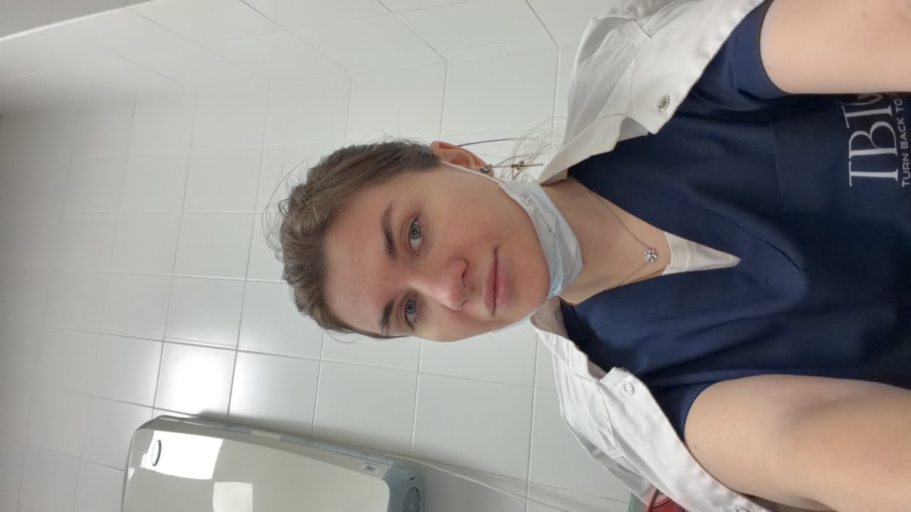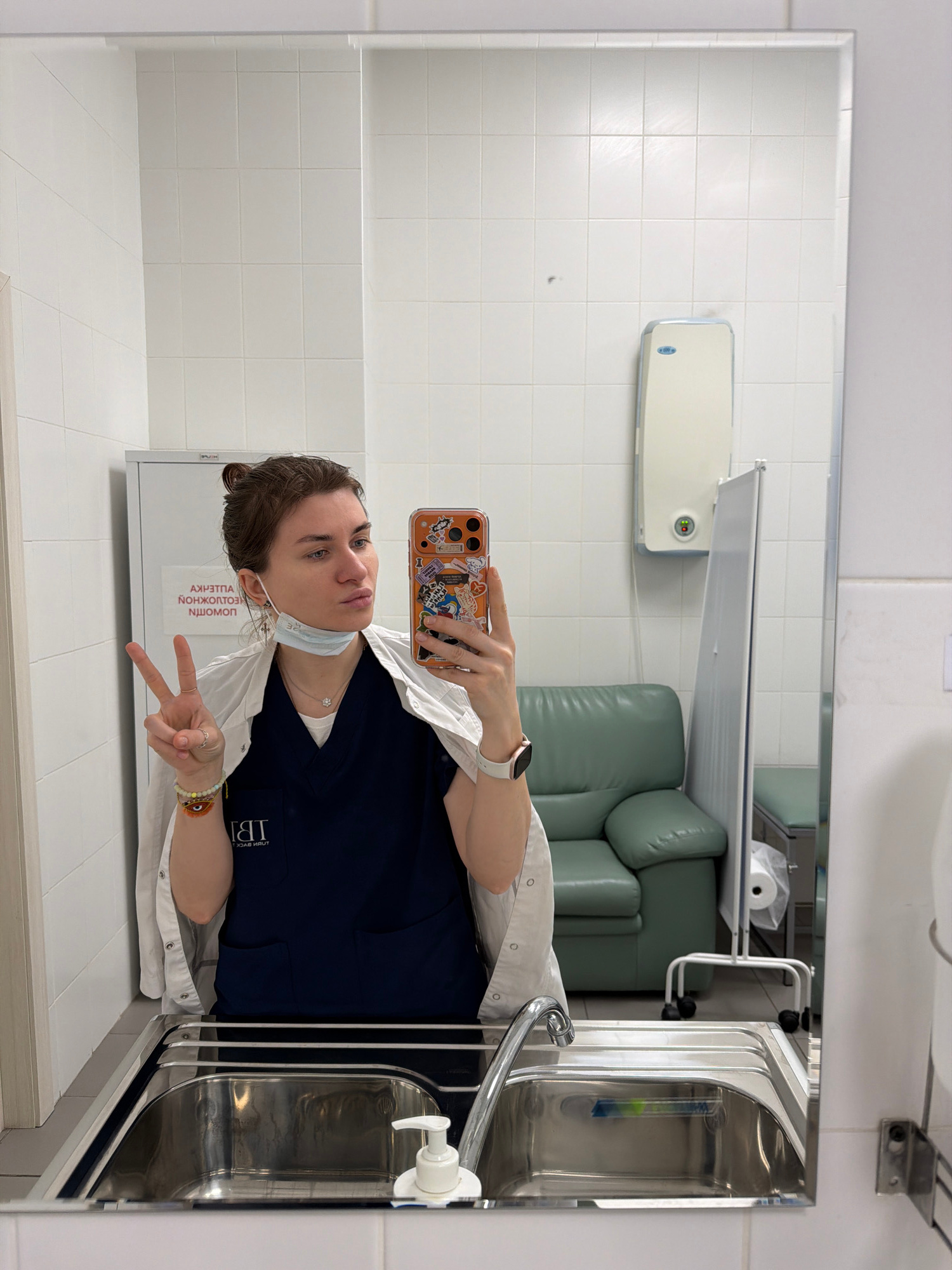 A person is taking a mirror selfie in what appears to be a clean, tiled room, possibly within a medical facility or public space. The individual, a woman, is holding a smartphone with a colorful, stic…read more