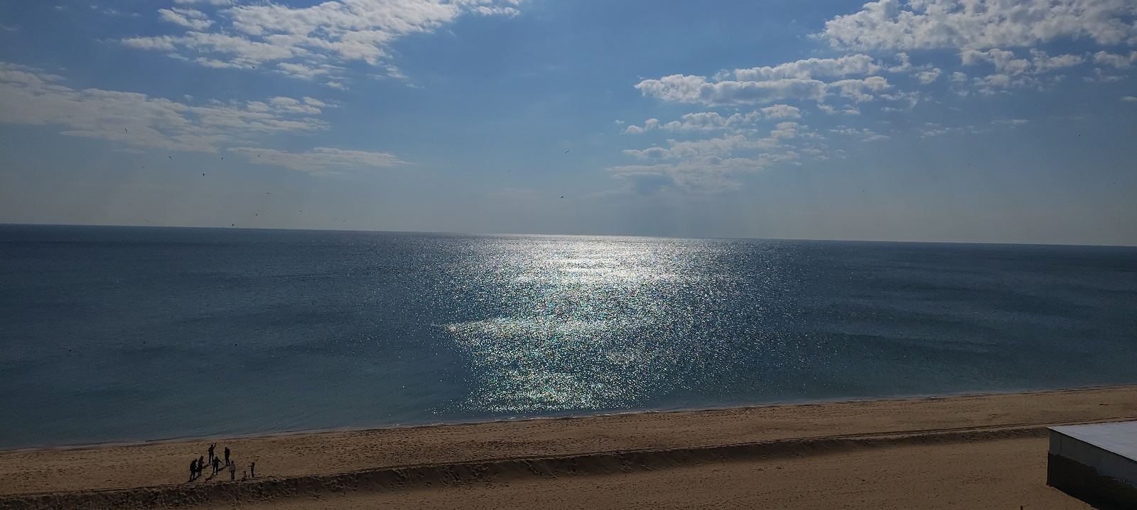 This image presents a broad coastal view, likely from a high vantage point overlooking a beach and the Black Sea in Varna, Bulgaria, on a clear, sunny day. The sky is a vibrant blue with scattered whi…read more