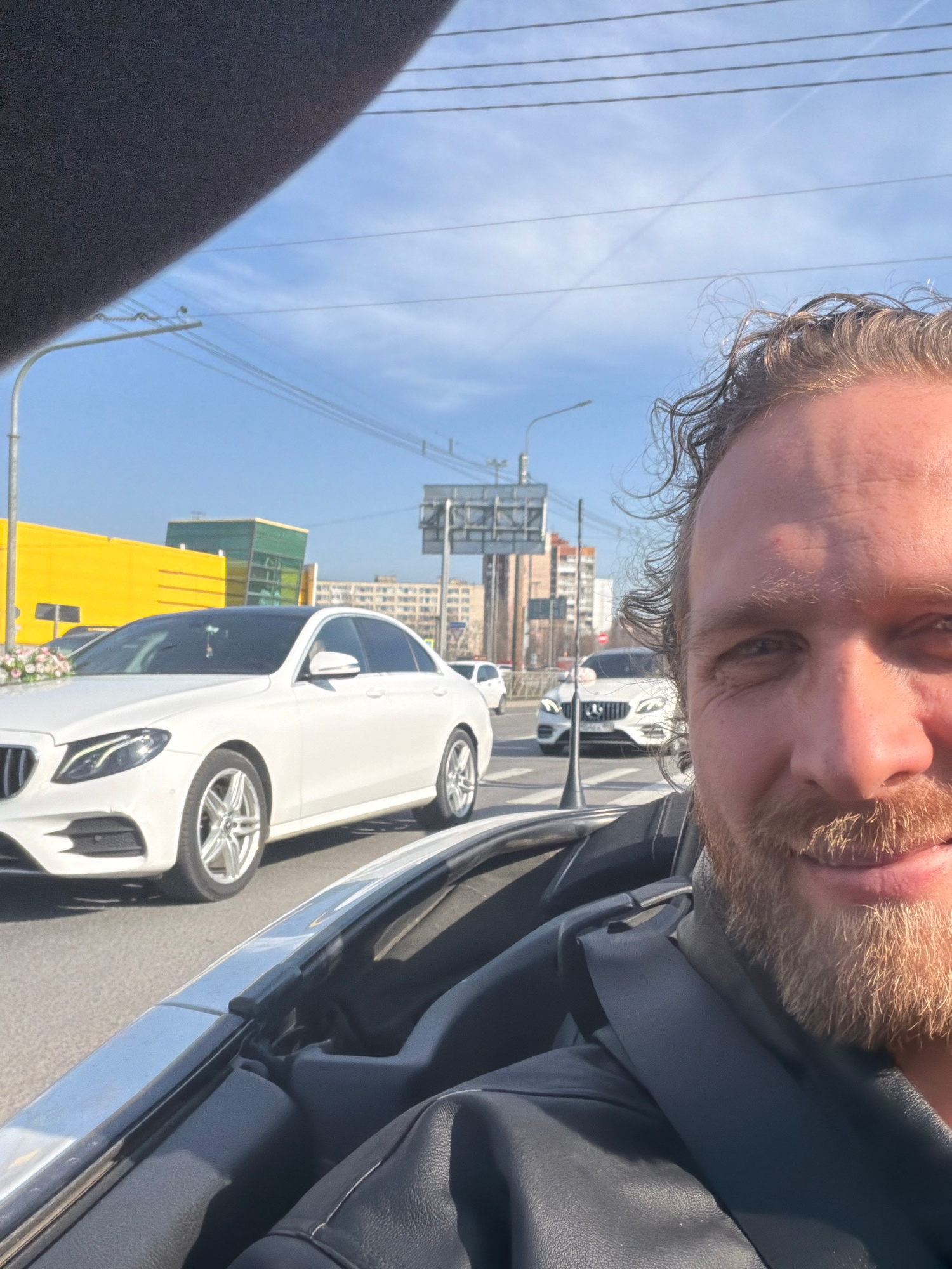 The image is a selfie of a light-skinned male with short, wavy blonde hair and a beard. He is wearing a dark-colored jacket. The picture is taken from inside a vehicle with the door open, revealing a white car parked on the street. Beyond the car, a street scene is visible with buildings, traffic lights, and overhead power lines. Based on the architecture and the signage visible, the location appears to be in an urban area. There is a yellow building visible across the road. There is a vehicle in front of the white vehicle. It is difficult to pinpoint the exact location in St. Petersburg without more context. | Open Wire