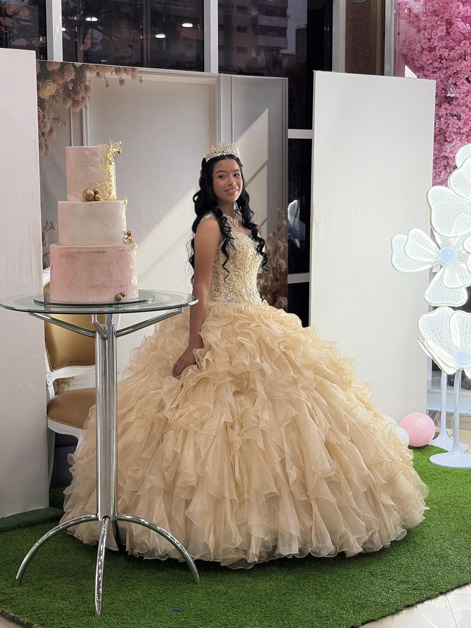 The image displays a young woman, likely a teenager celebrating a significant event such as a quinceañera, posing in an elaborately decorated indoor setting. She has long, dark, wavy hair and is weari…read more