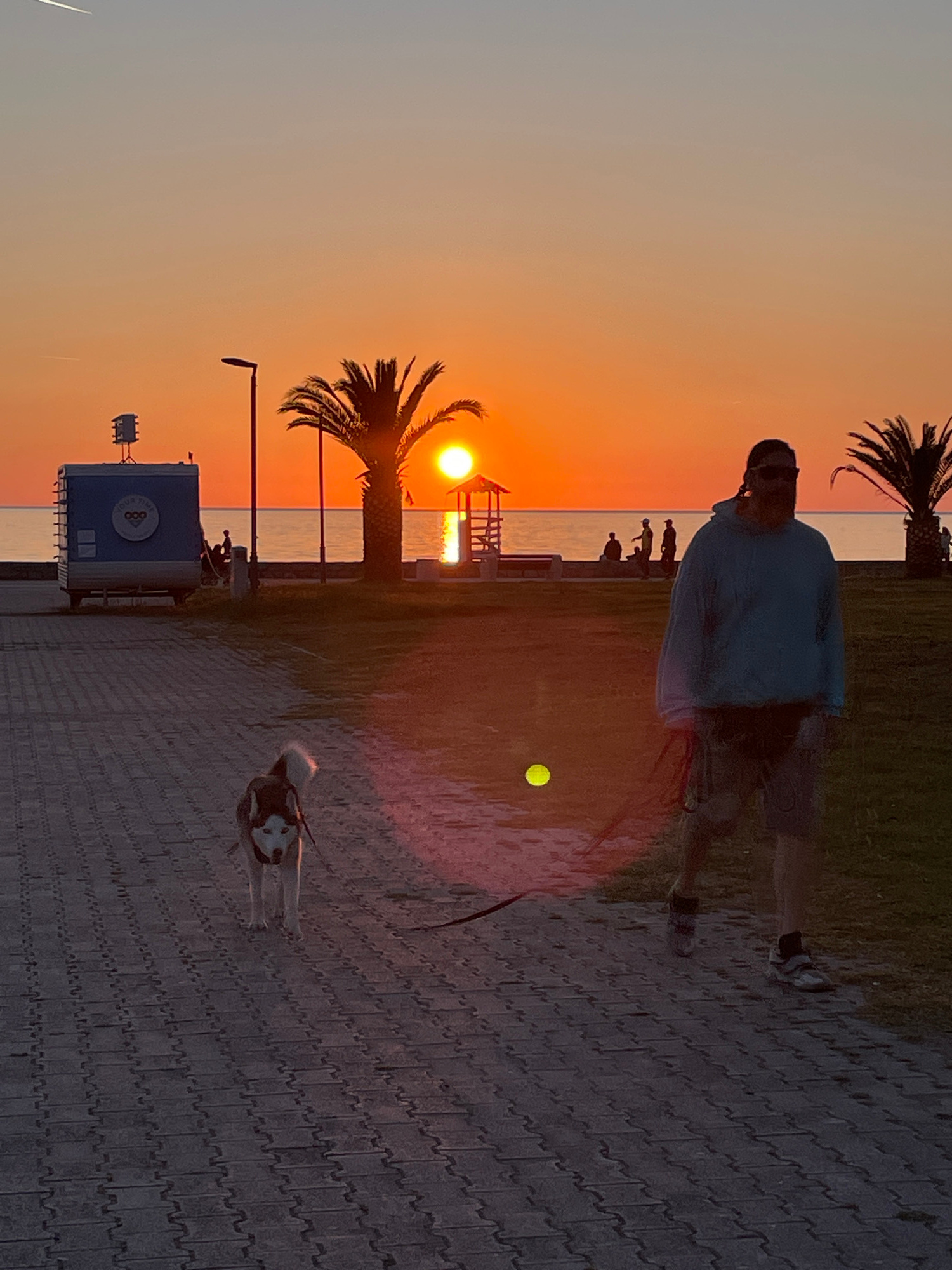 A photograph captures a scene at the city of Bar, Montenegro during sunset, showing a man, a dog, and a yellow tennis ball. The man is on a lawn and is holding a tennis racket. The dog is on a pathway…read more