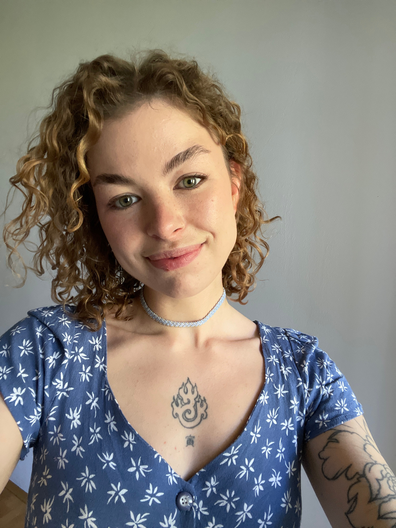 A young woman with curly light brown hair and green eyes is pictured from a slightly low angle, as if the photographer is looking up at her. She is smiling gently. She is wearing a blue floral-pattern…read more