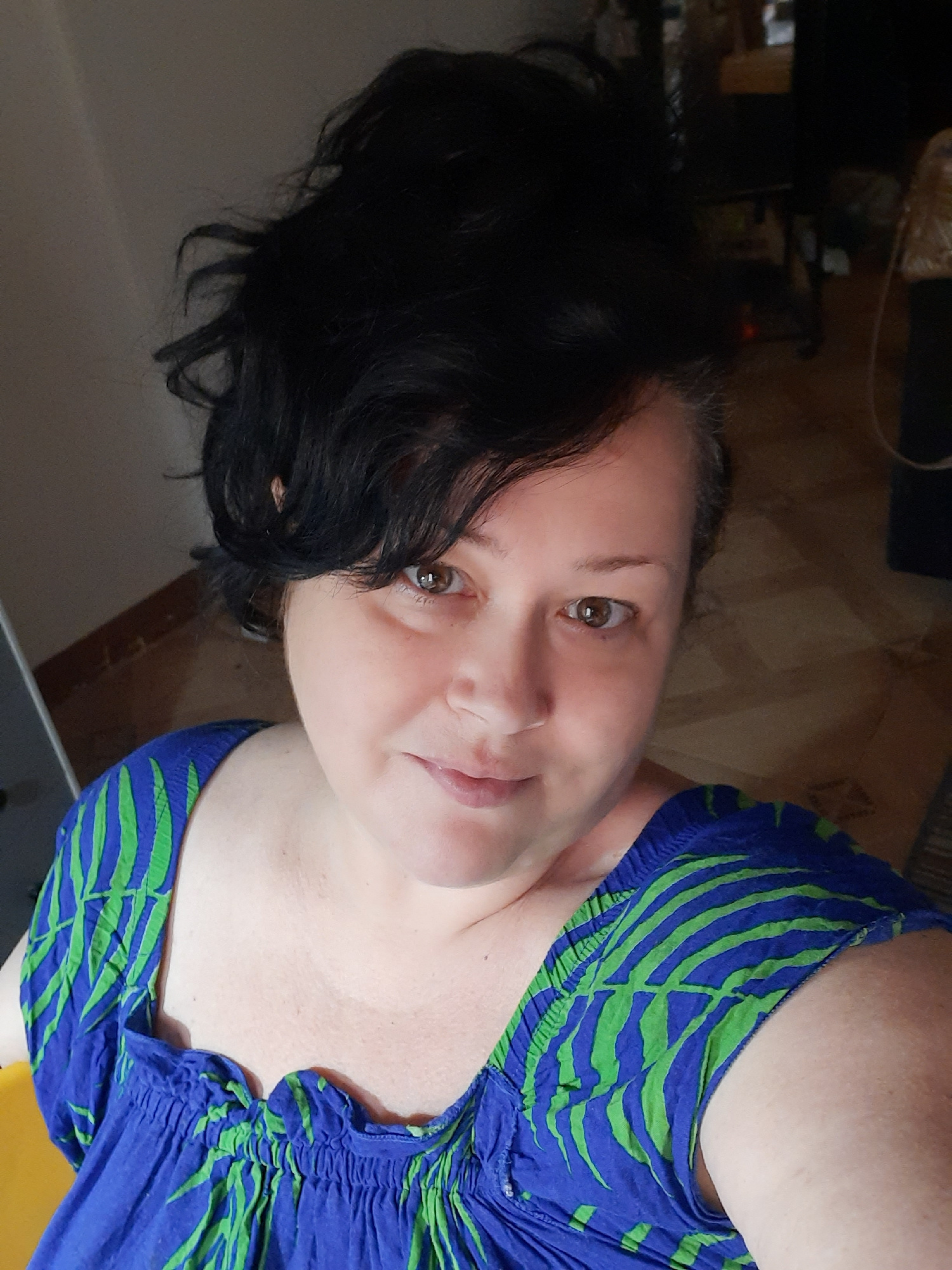 A woman with dark hair is wearing a blue and green patterned blouse. The location is Al Hadaba, Egypt. She appears to be indoors with a tile floor and some furniture visible in the background.