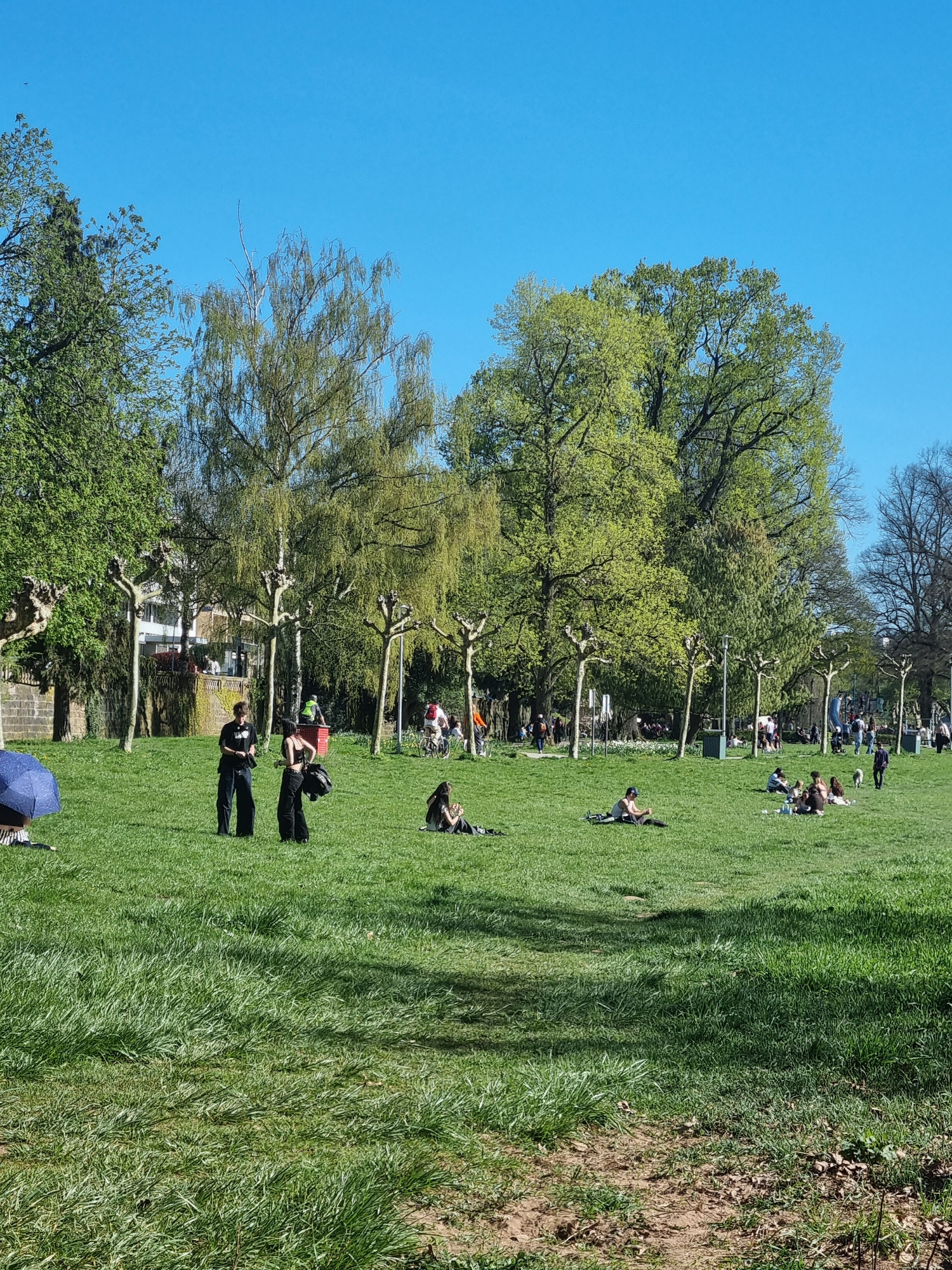 The image shows a sunny day in a park in Saarbrücken, Germany. Several people are relaxing on the green grass. Some are lying down, while others are sitting. A few trees line the park, providing shade…read more