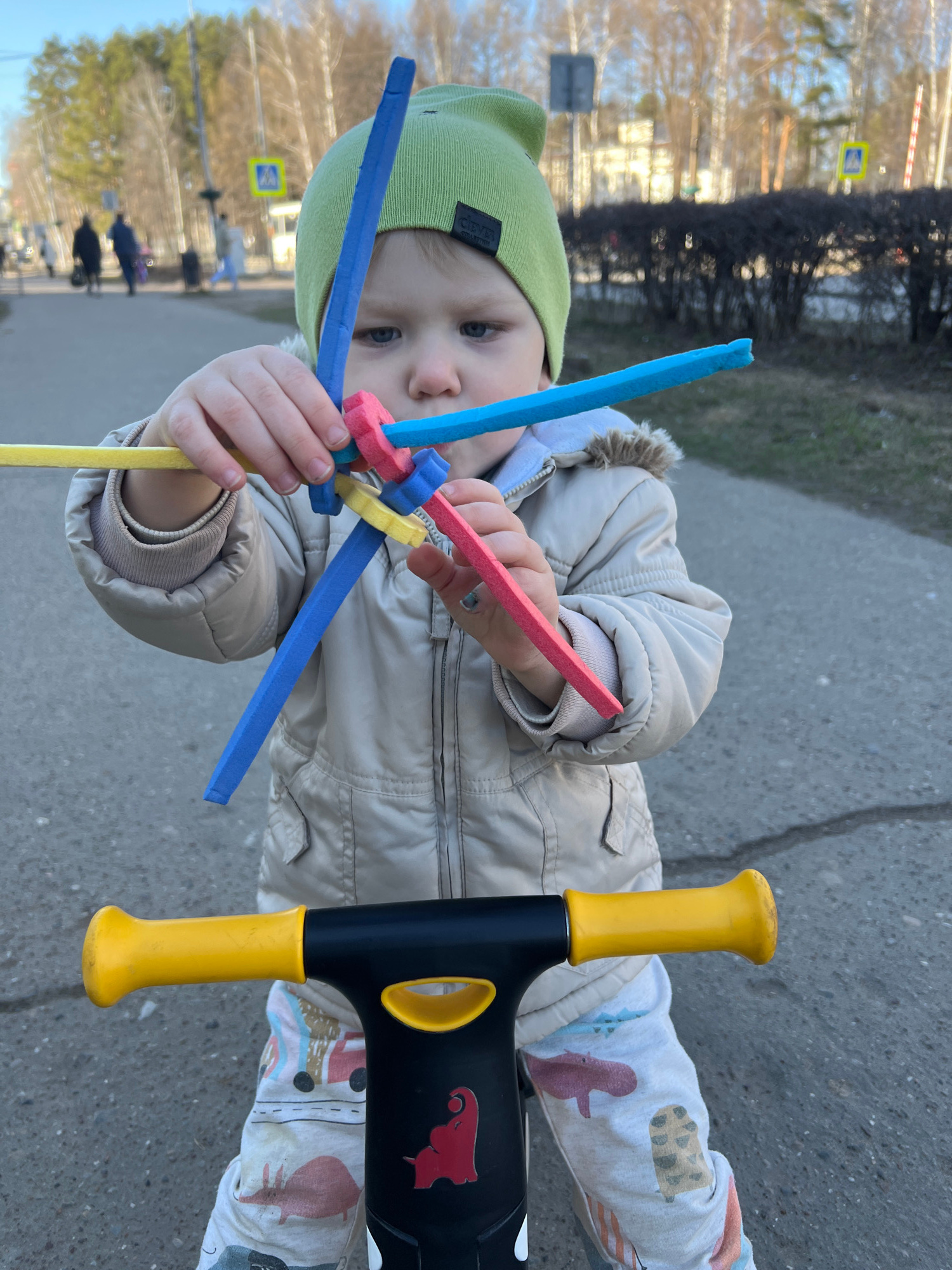 A child in a green hat and beige jacket holds a colorful toy with yellow, blue, and red foam pieces. The child stands on a gray paved surface next to a black pogo stick with yellow handles. In the bac…read more