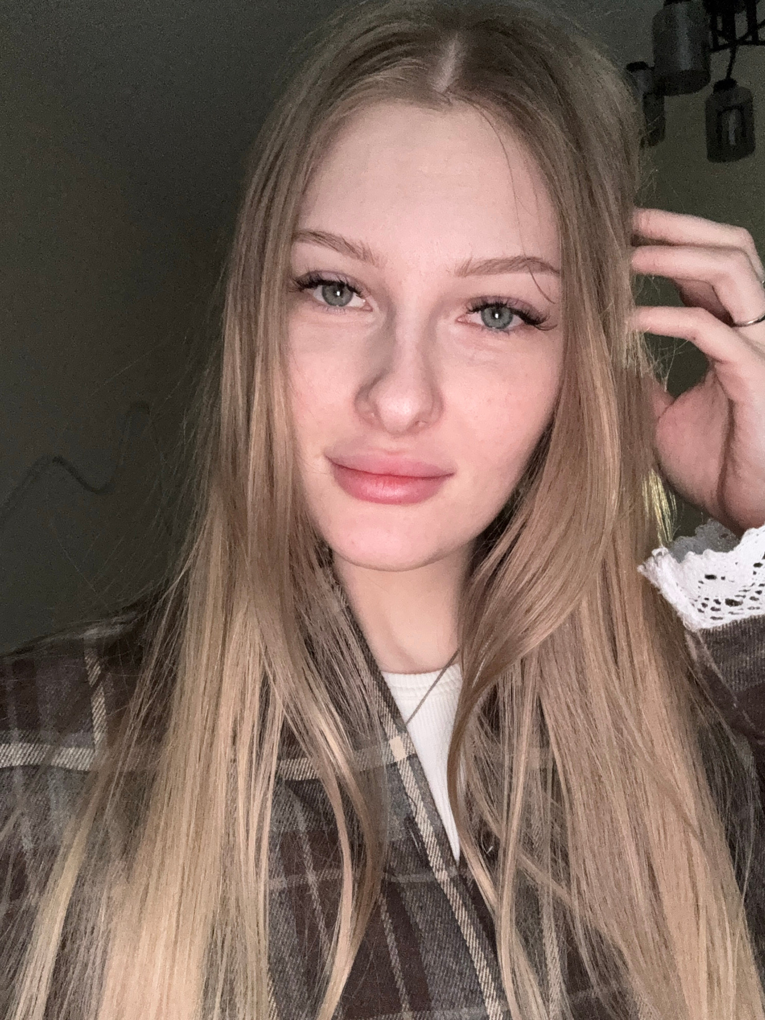 A young Caucasian woman with long, light blonde hair poses for a selfie. She is wearing a brown plaid shirt with a white lace trim at the cuff. Her skin is fair, and she has light blue eyes. One hand…read more